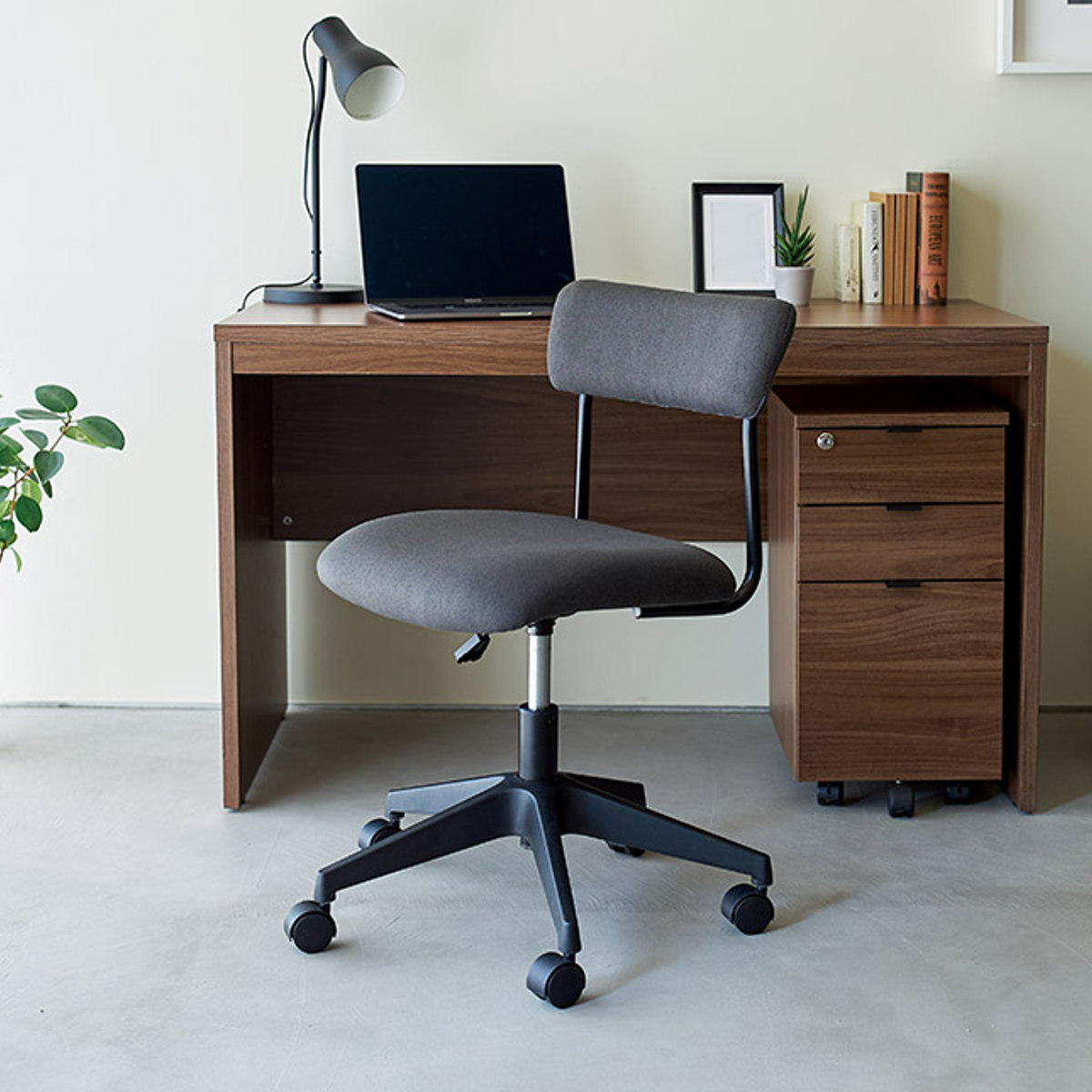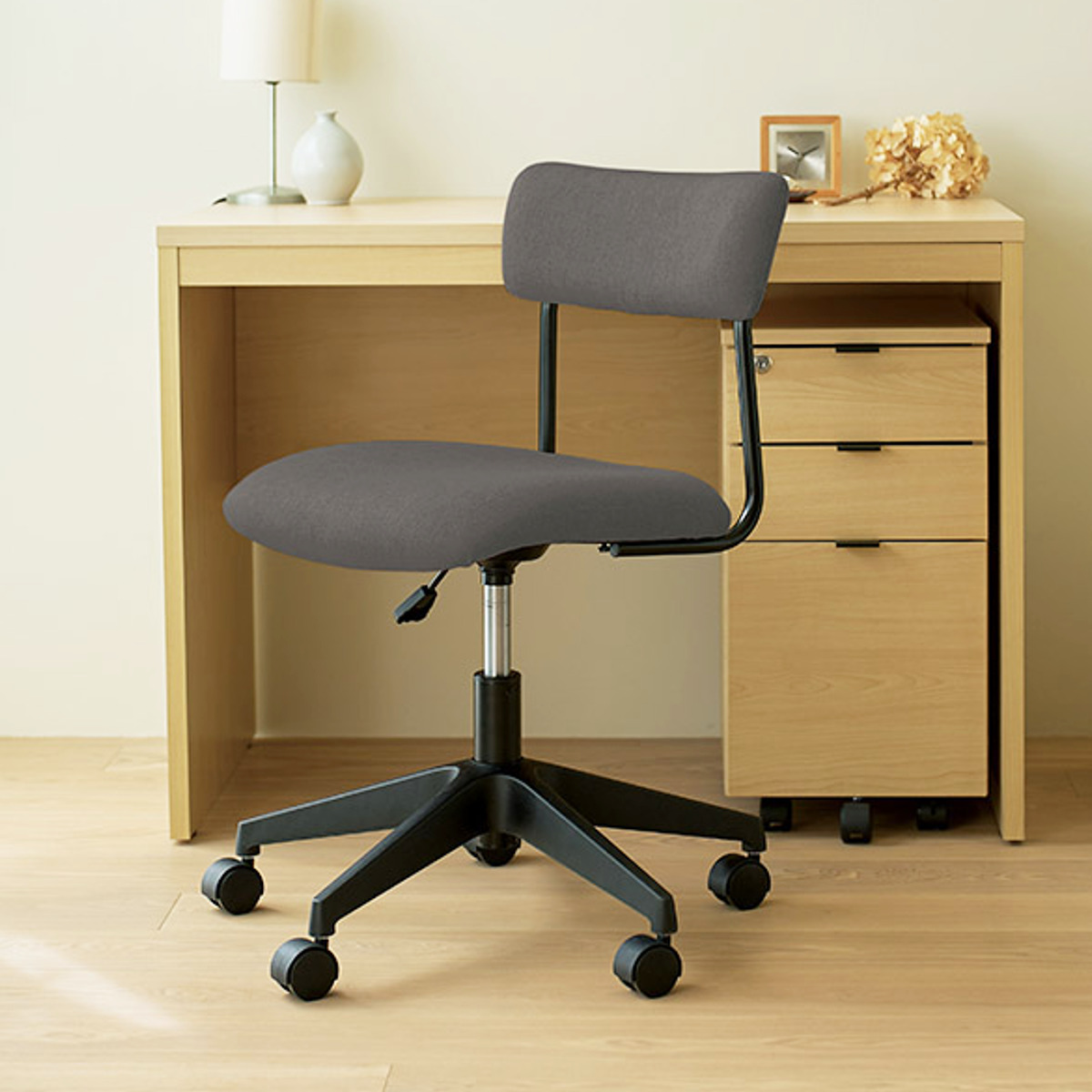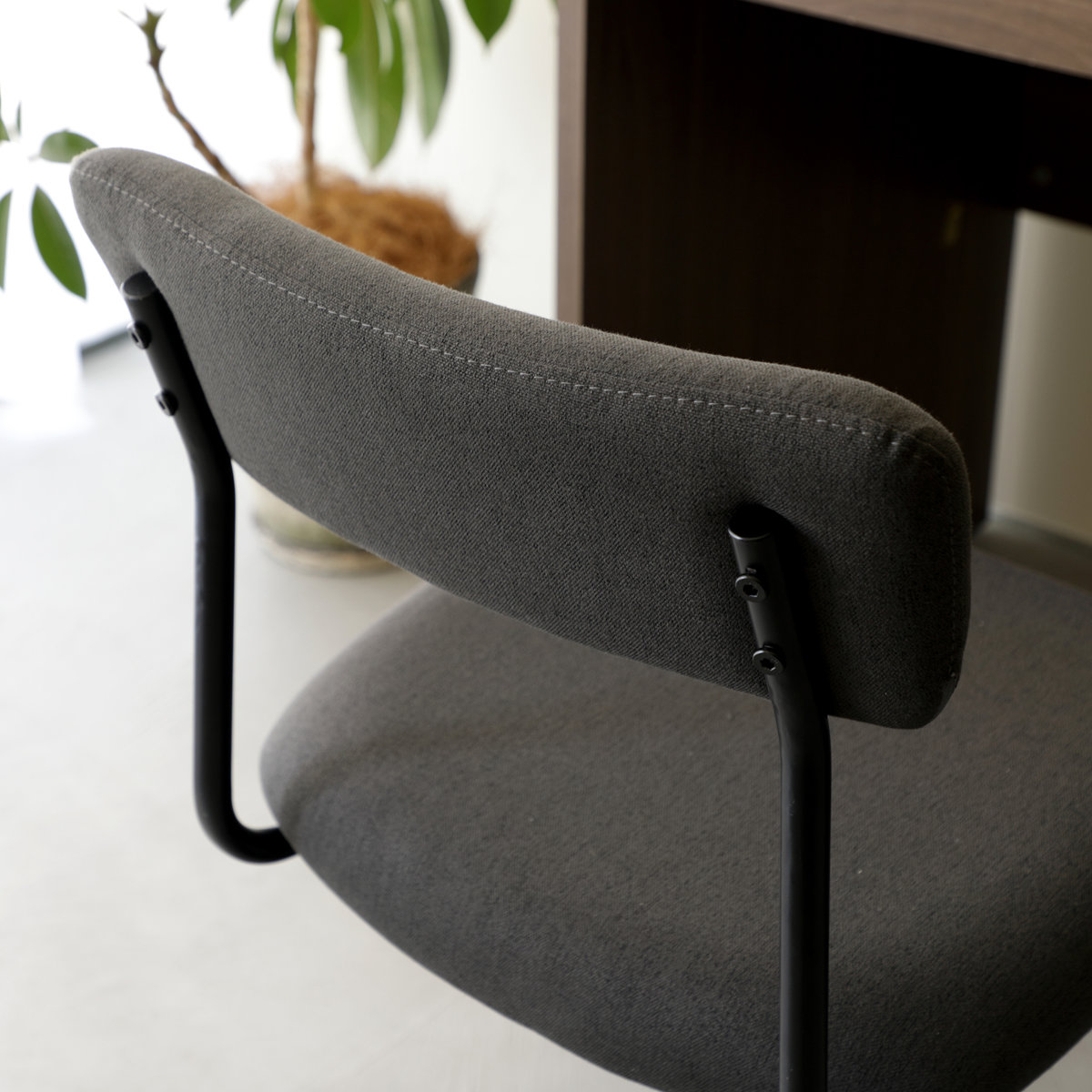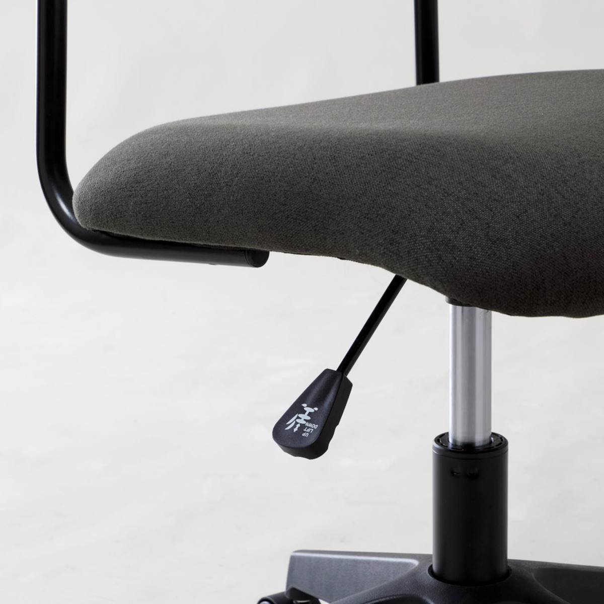 ワイドな背もたれを、抜け感のある細身のブラックフレームで支えた、軽快でスタイリッシュな昇降式ワークチェアです。張地には、織りの細かいシンプルな質感のファブリックを使用しており、インテリアのテイストを選ばず、さまざまなお部屋に自然になじみます。