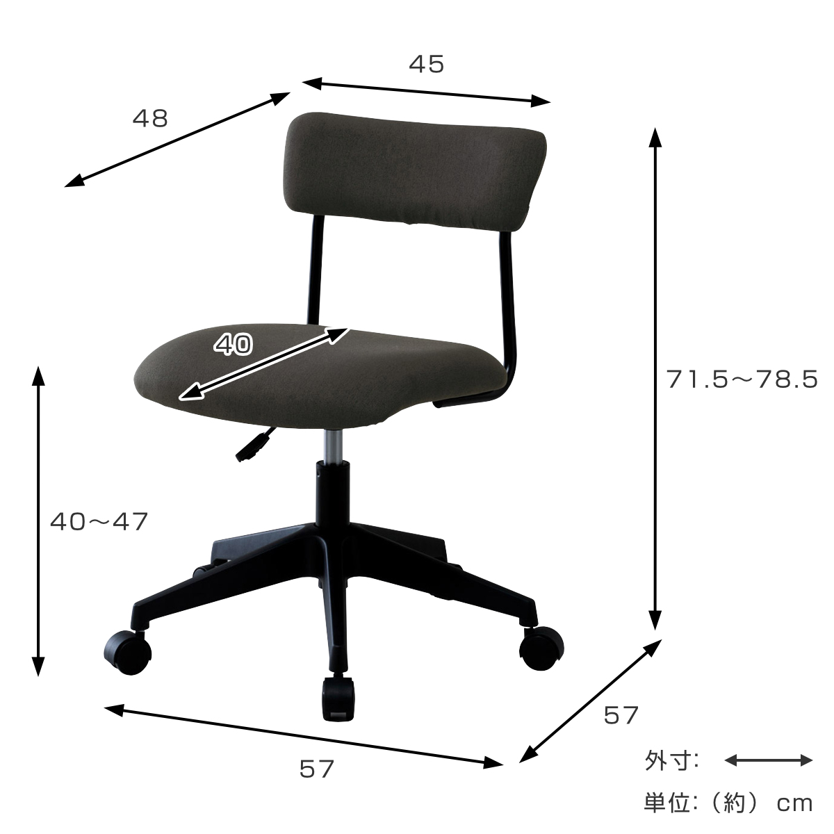 | サイズ | 約 幅57×57×71.5~78.5(cm) 座面高:40~47(cm) |