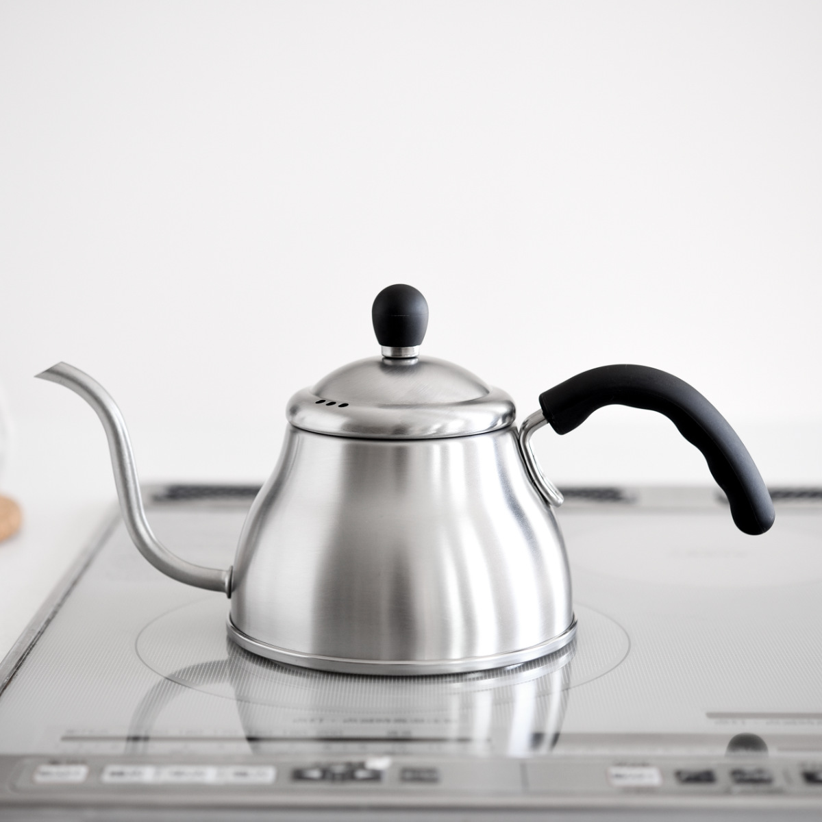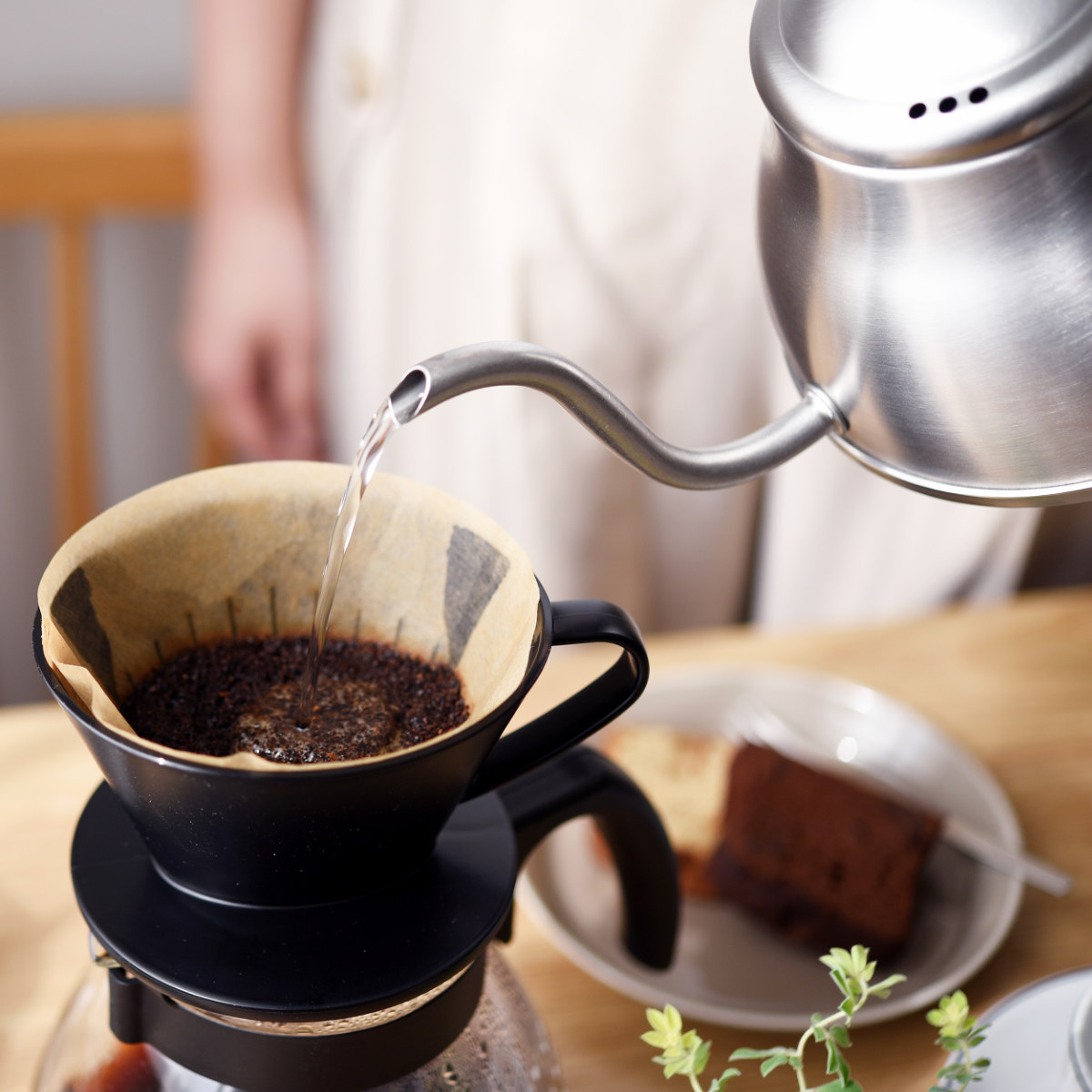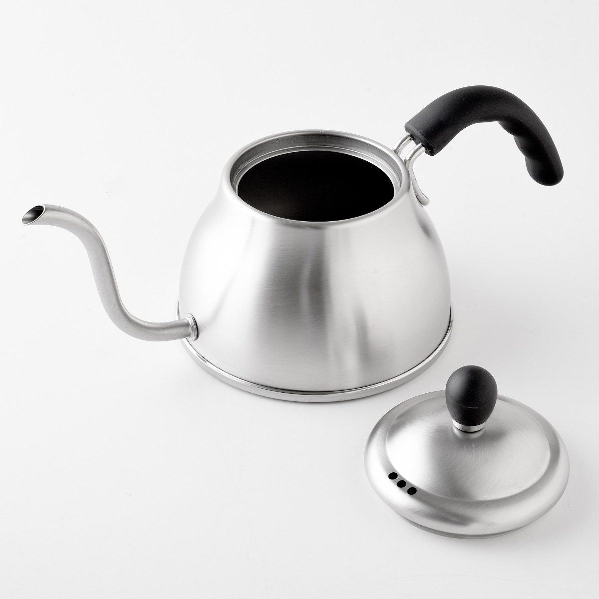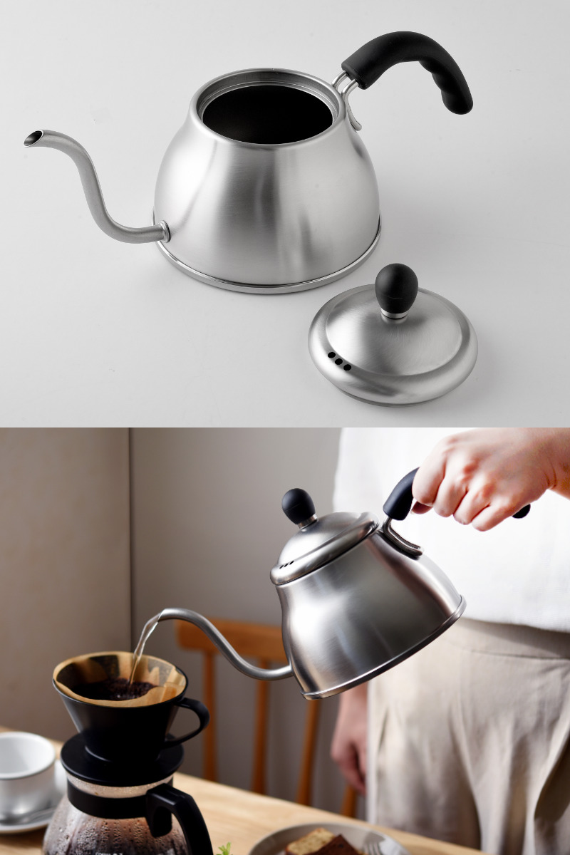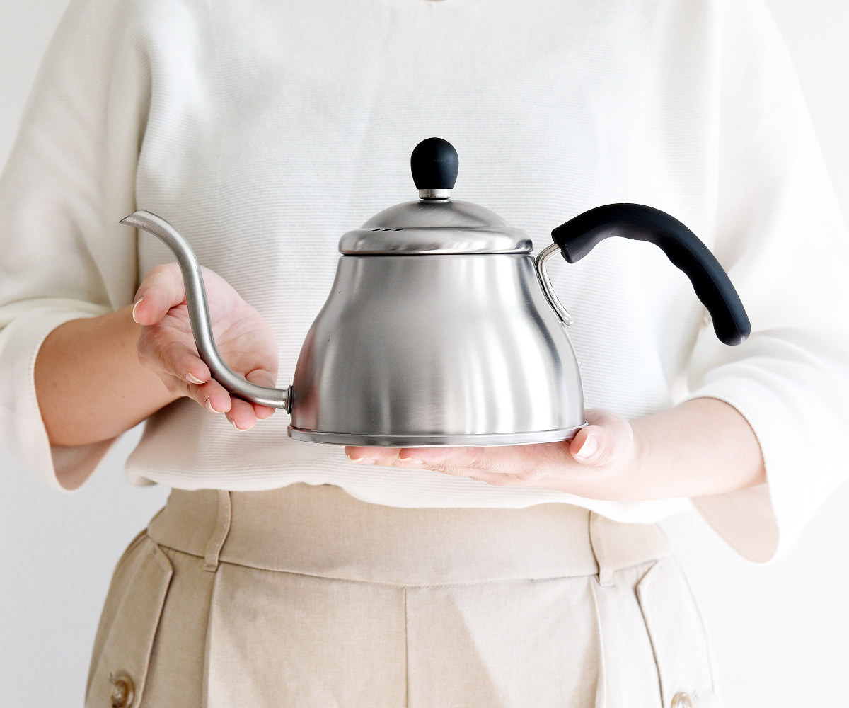 お湯を一定の量で静かに注ぐことができ、微妙な湯量調節も自在に行える細口です。狙った位置にゆっくりと注げるため、ハンドドリップコーヒーに適しています。