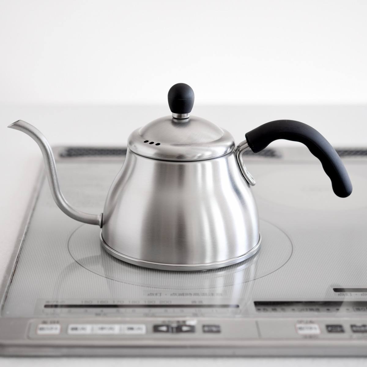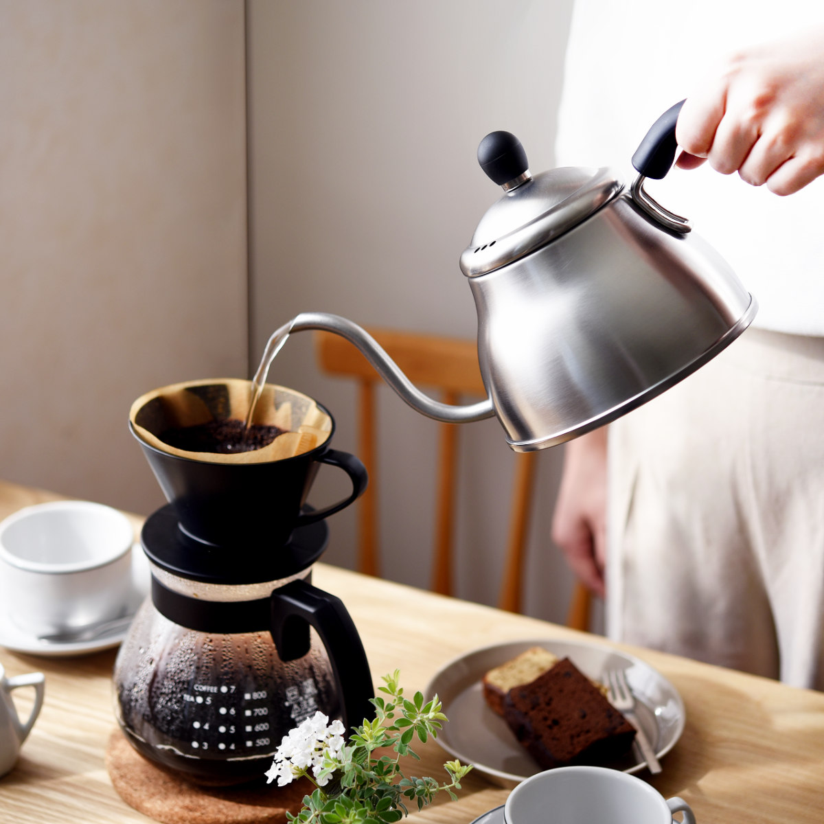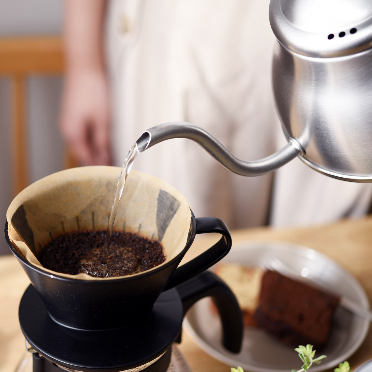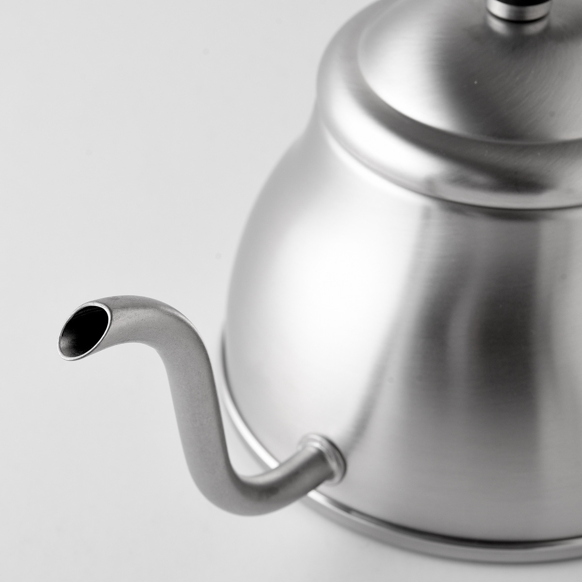お湯を一定の量で静かに注ぐことができ、微妙な湯量調節も自在に行える細口です。狙った位置にゆっくりと注げるため、ハンドドリップコーヒーに適しています。