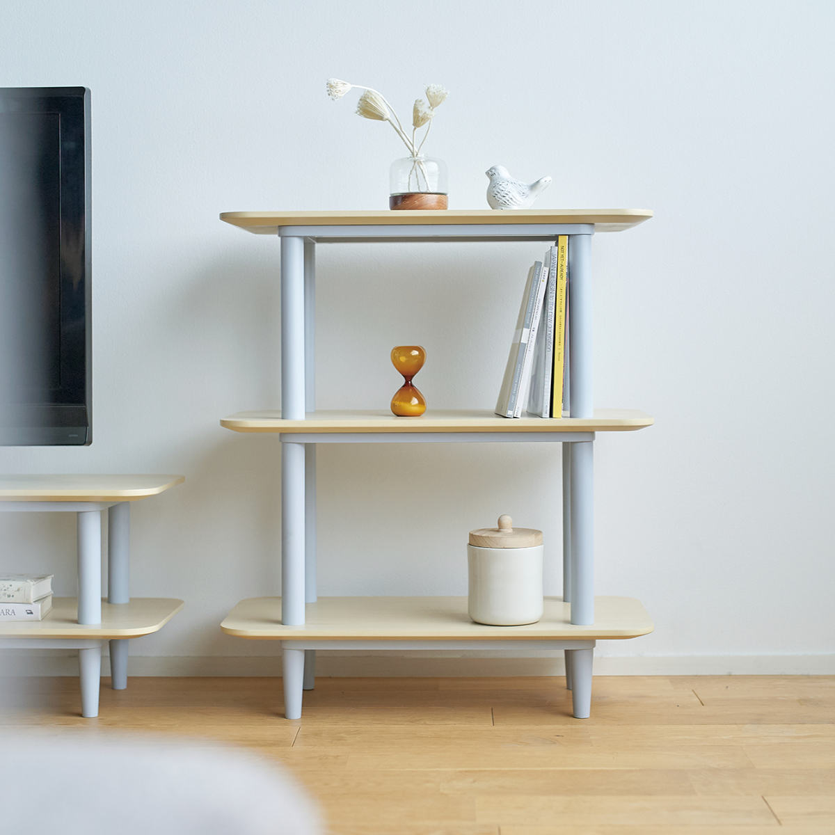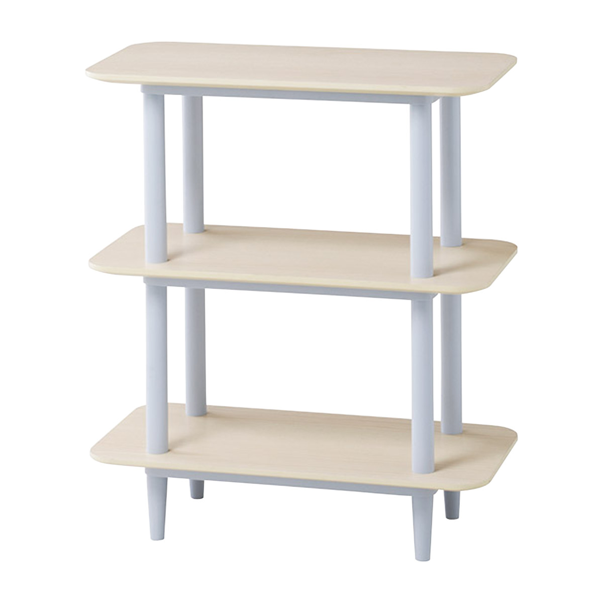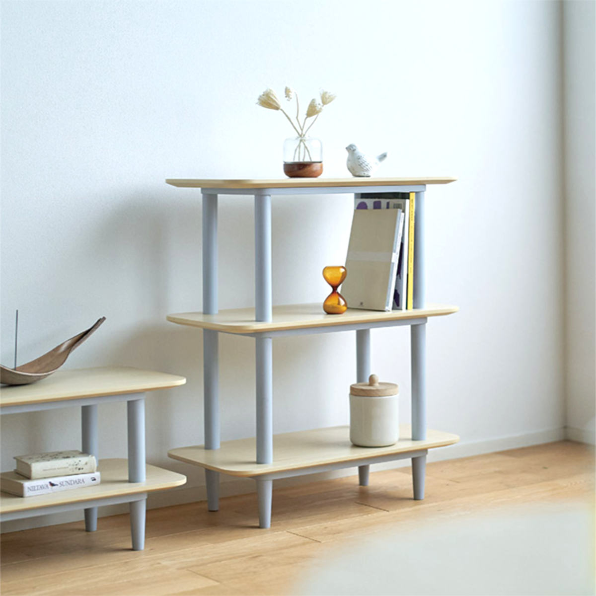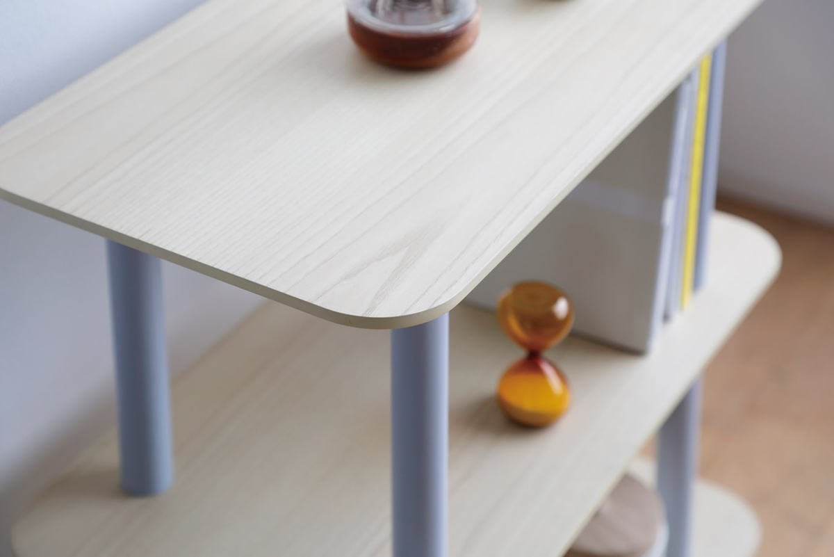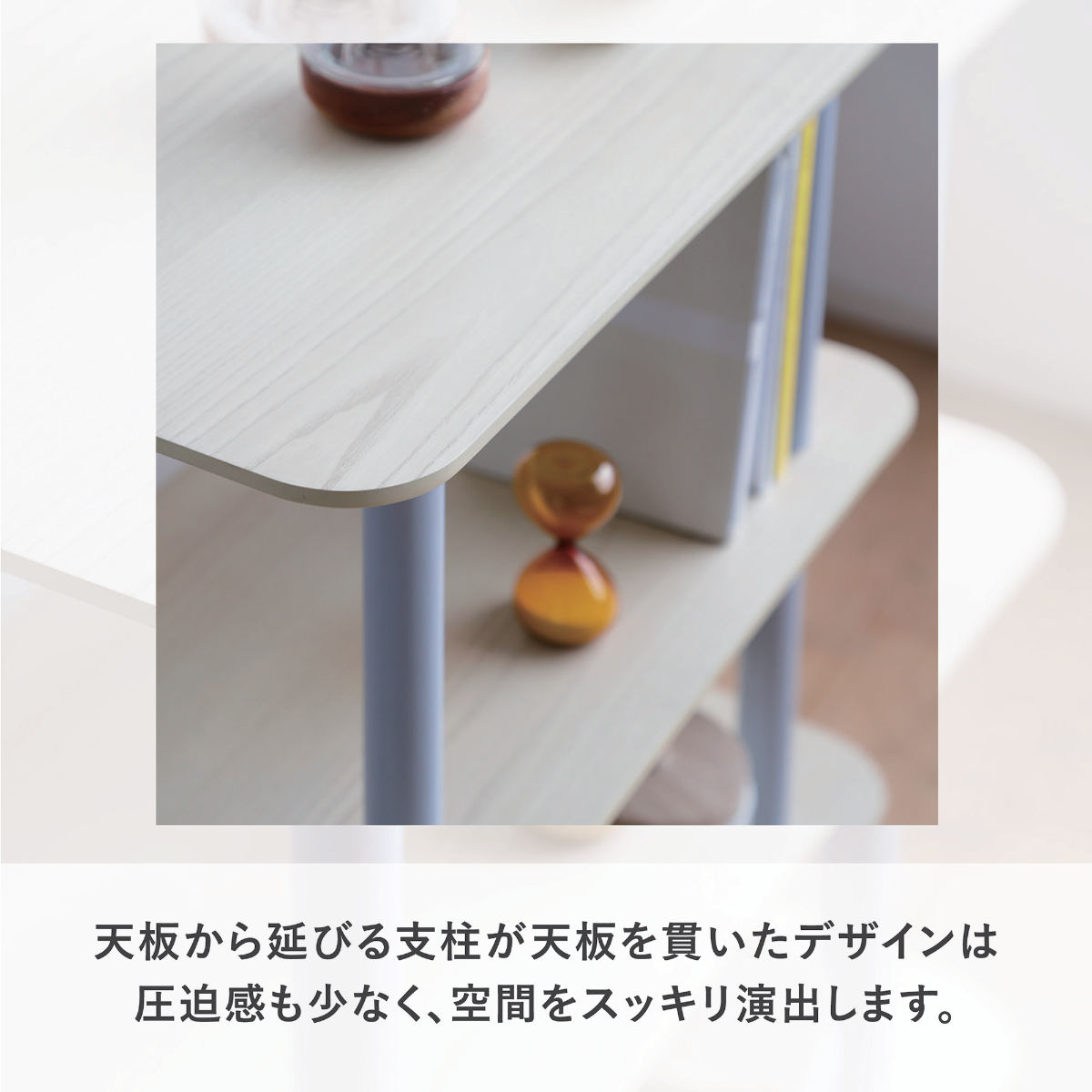 天板から延びる支柱が棚板を貫いたデザインは、圧迫感が少なくスッキリとしています。お気に入りの小物をディスプレイして、北欧テイストや明るい雰囲気のお部屋にマッチするインテリアに◎