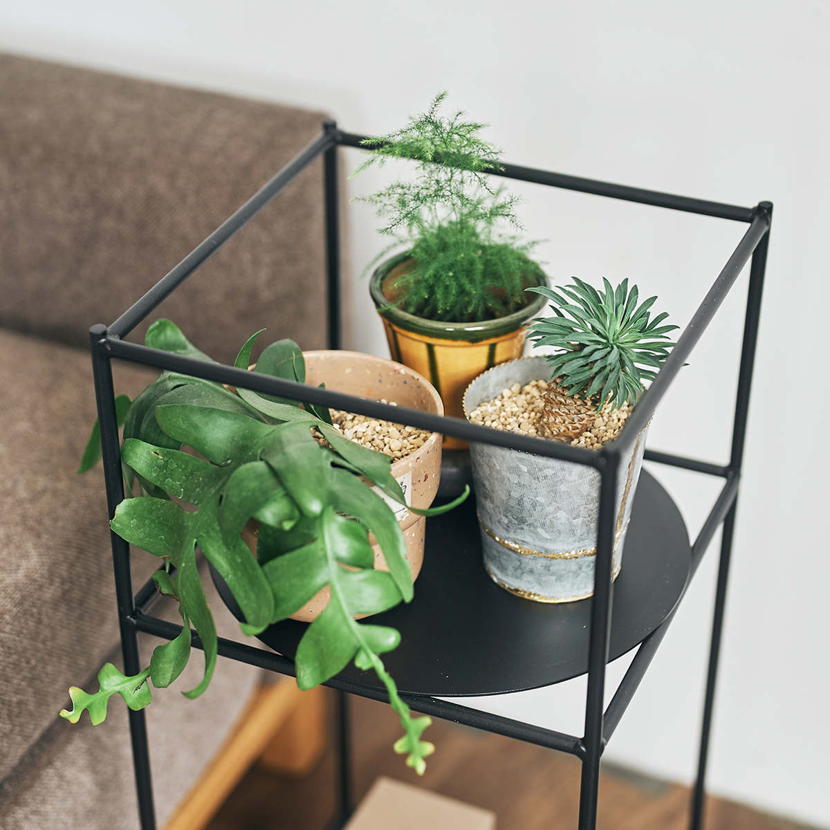 無駄を省いたミニマルなデザインのスチール製プランツラックです。細身のフレームが圧迫感を与えず、リビングや玄関、窓辺など、どんな場所にもすっと馴染みます。お気に入りの観葉植物を程よい高さでディスプレイでき、空間に立体感とアクセントを与えてくれます。