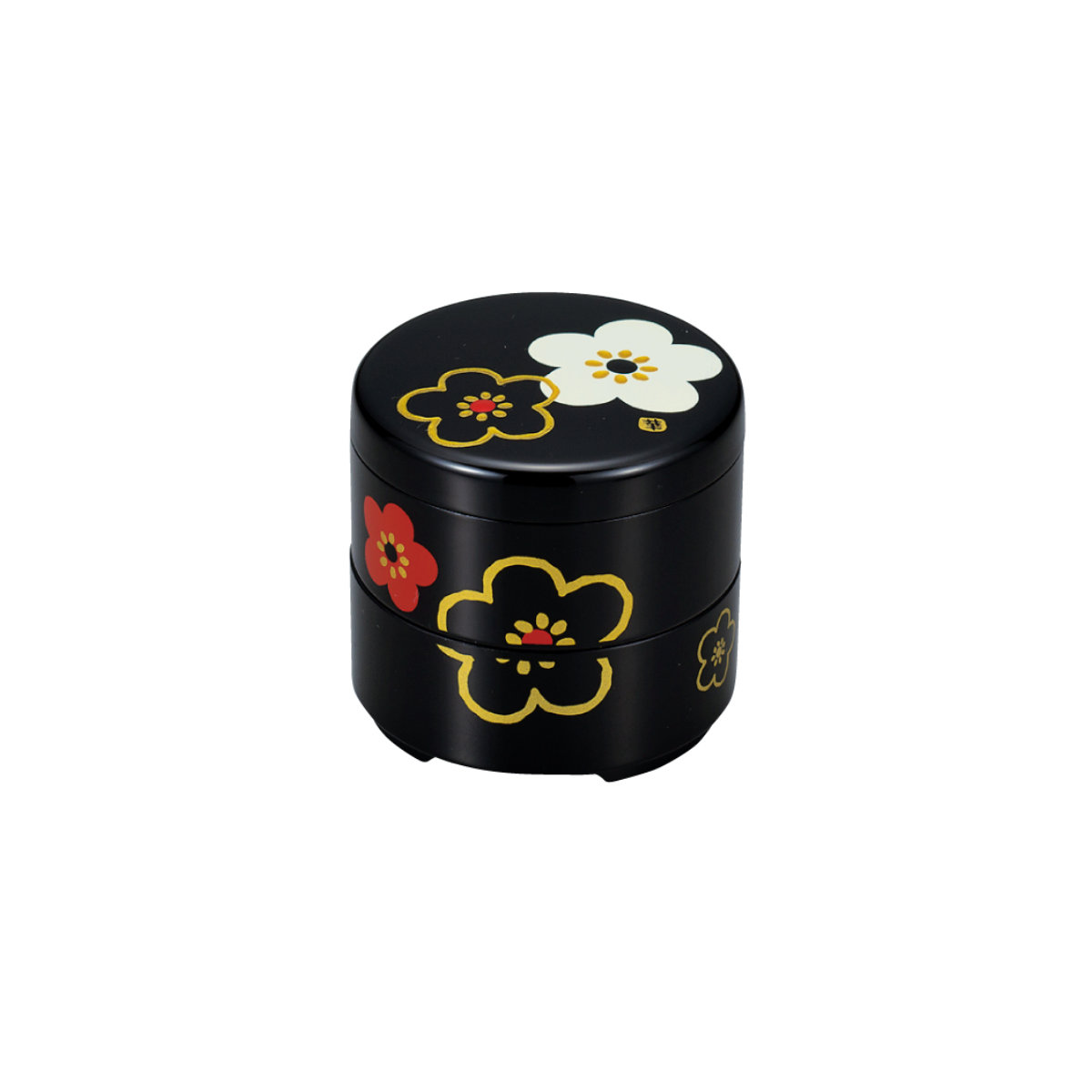 お重 ミニ丸お重珍味入 HAKOYA 花文様梅 160ml ( 日本製 プラスチック 小さい 丸 和食 二段 和風 弁当箱 ランチボックス ギフト 和柄 おせち料理 おせち お節 御節 二段弁当箱 ) 【黒華文様梅】