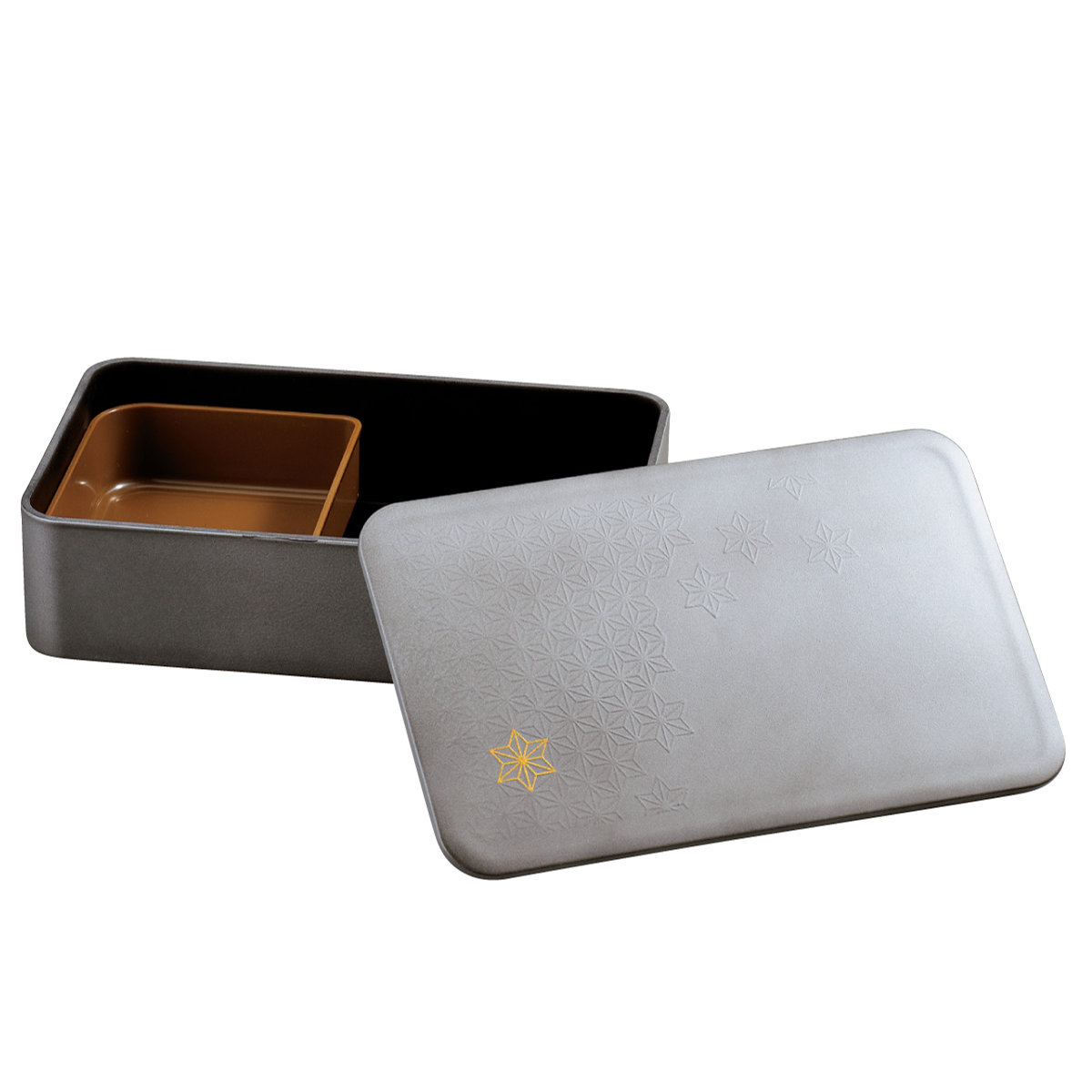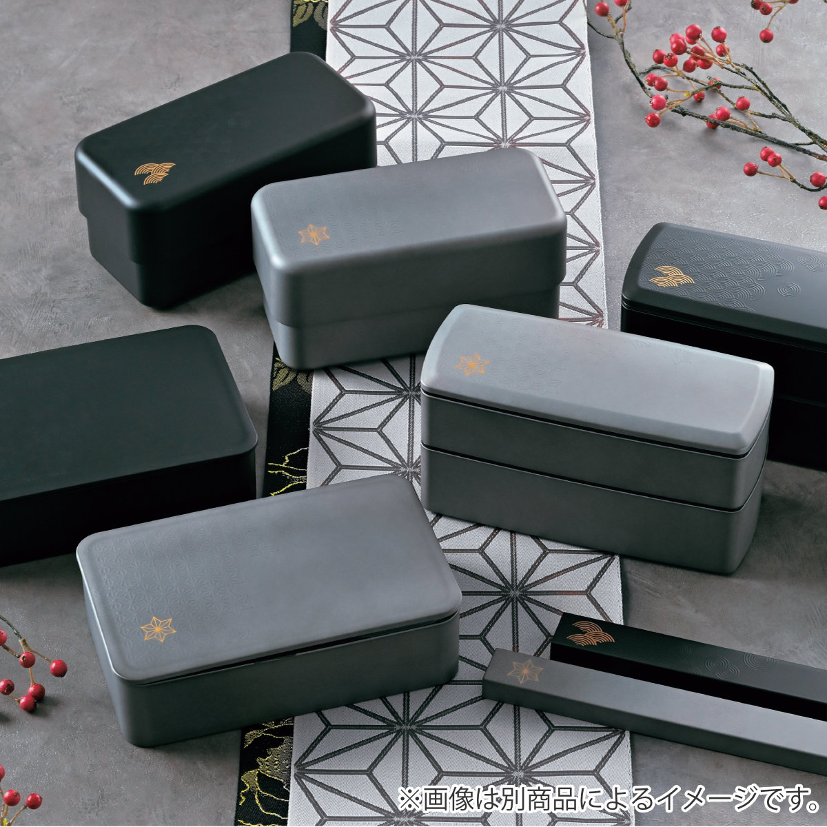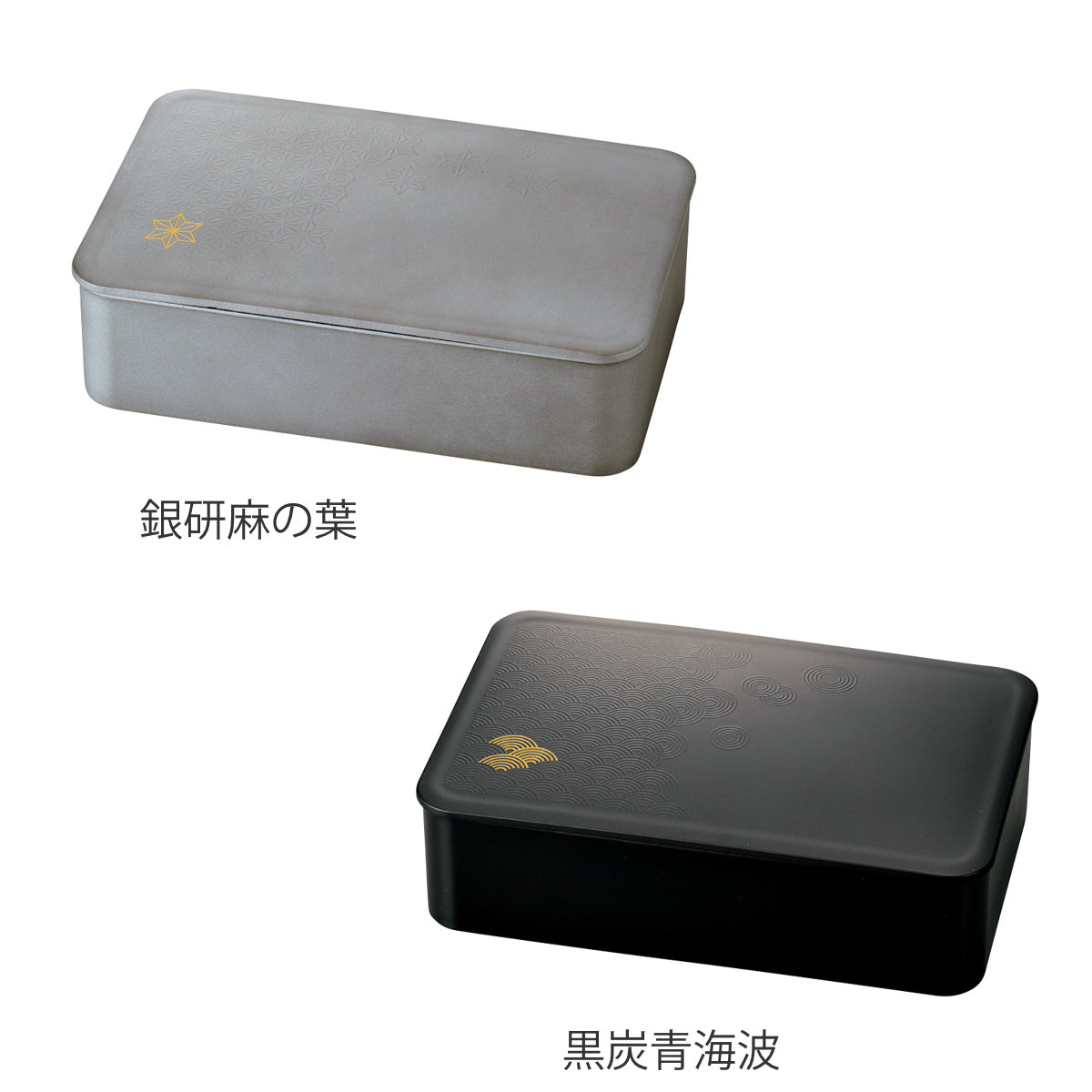 金色の麻の葉と青海波の模様が目を引く、美しい同モチーフのお弁当箱もご用意しています。