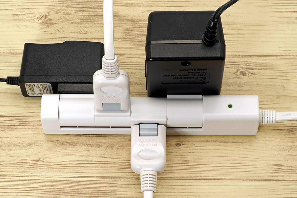差込口が回転するので、3方向から差してスッキリ配線できる電源タップです。大きくて邪魔になりがちなACアダプターも干渉しないので、差込口を無駄なく使用できます。
