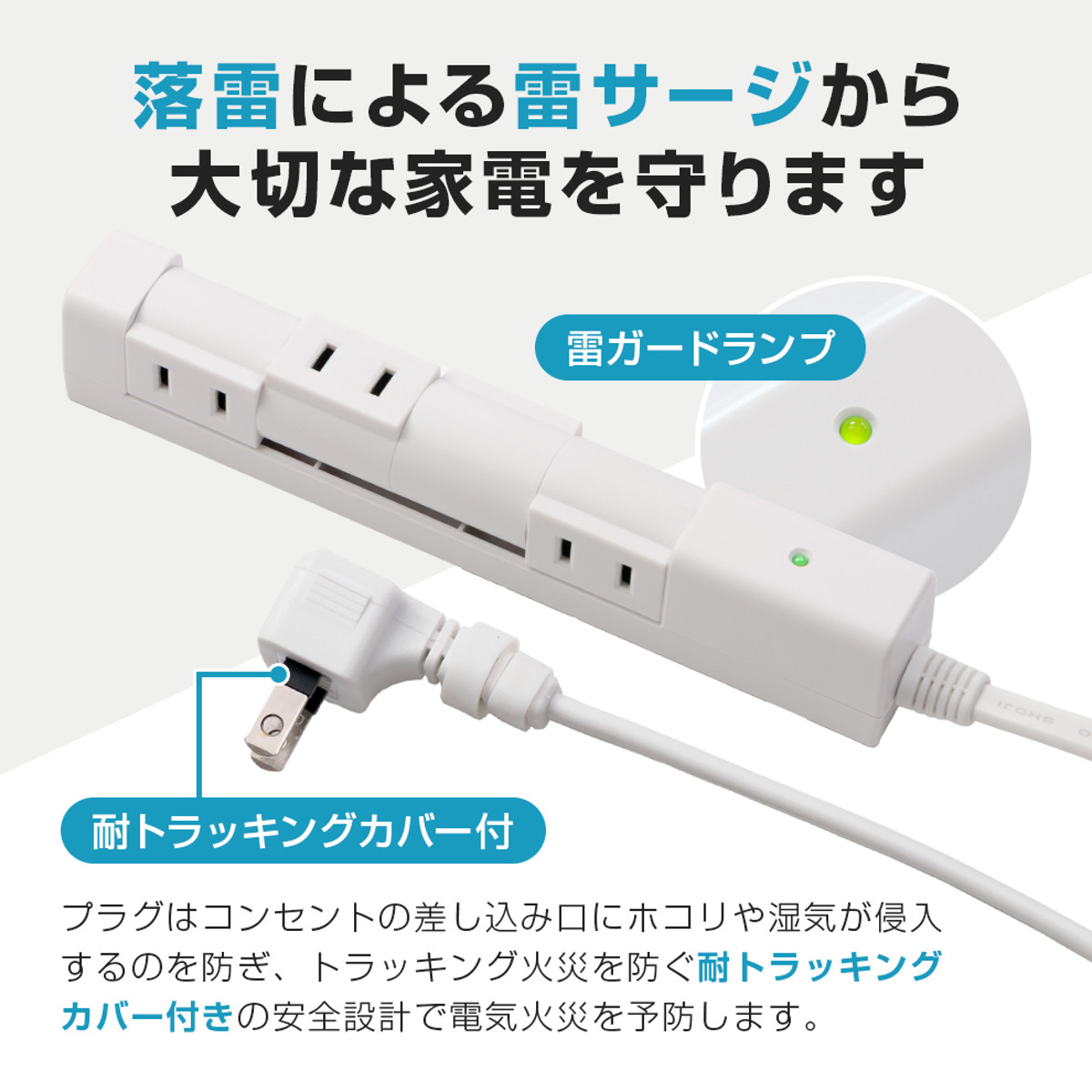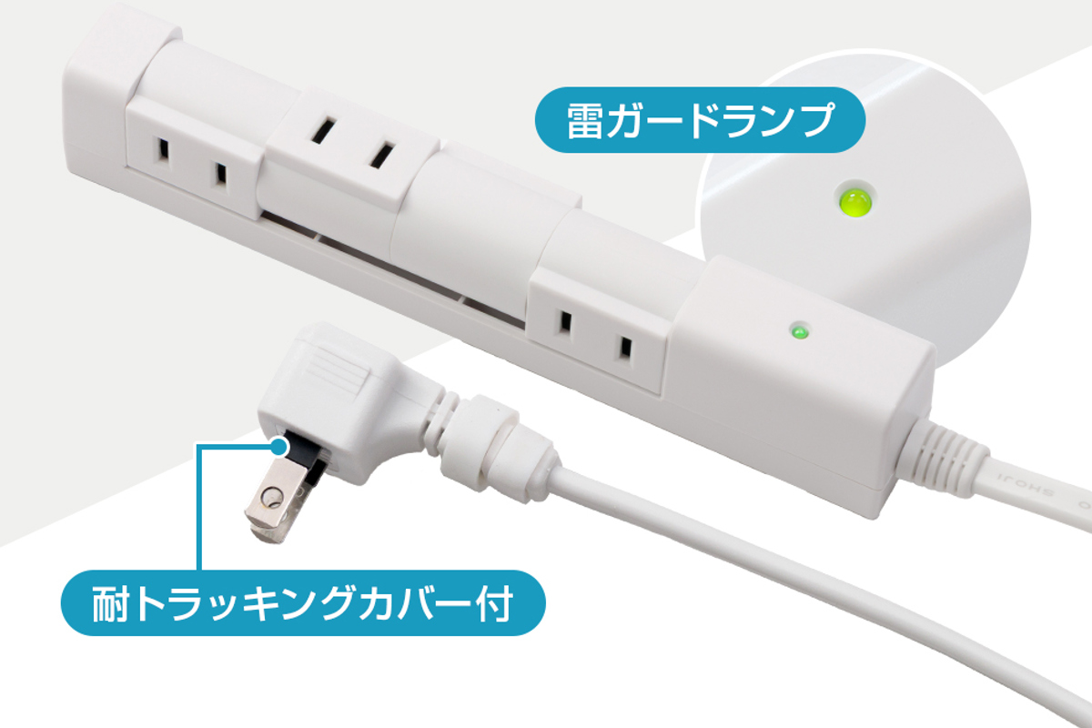 落雷時、瞬間的に発生する高電圧が原因で配線・ケーブルなどを通じて電化製品が壊れてしまうことがあります。こちらの電源タップは落雷対策ができる雷ガード付き。ホコリや湿気によって発生するトラッキング火災も防止する安心設計です。