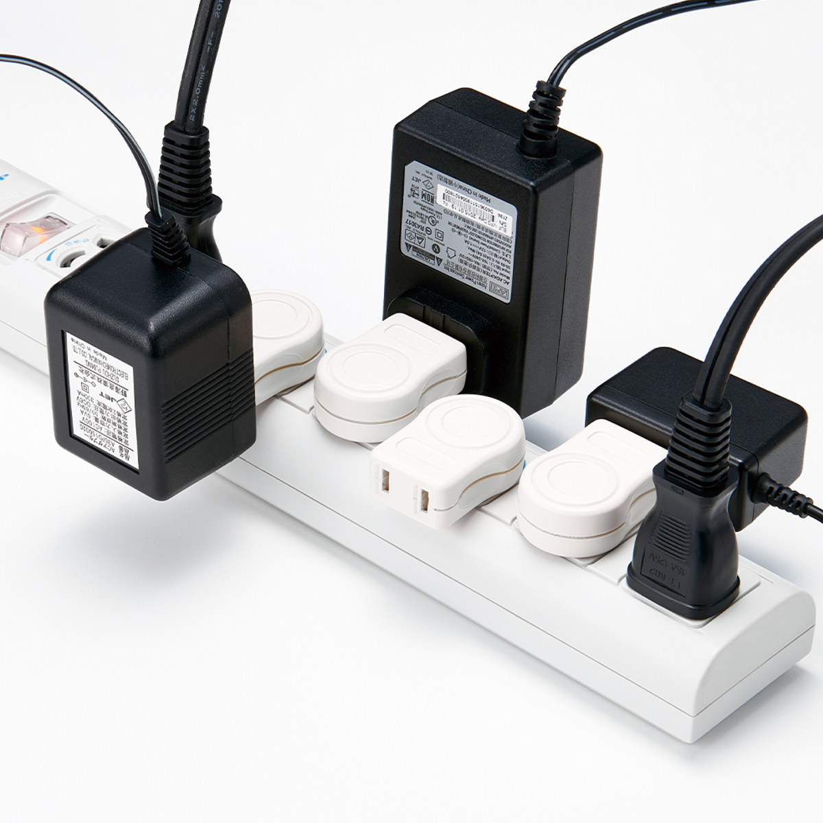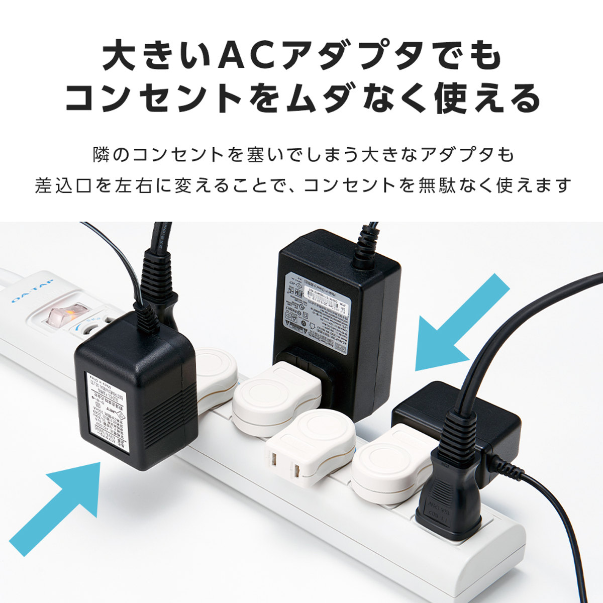 差込口を左右に変えることで、大きくて邪魔になりがちなアダプタも干渉しないので、差込口を無駄なく使用できます。