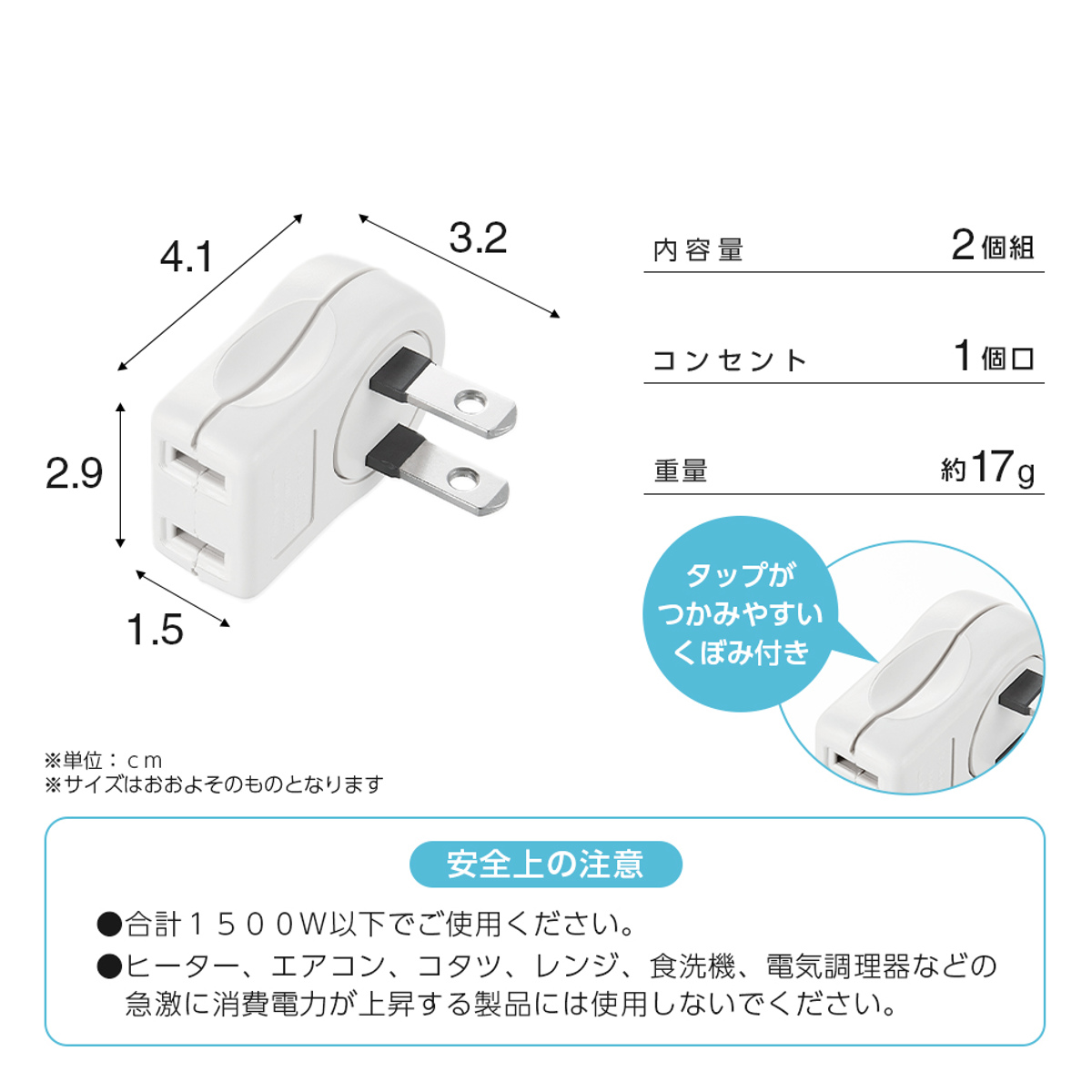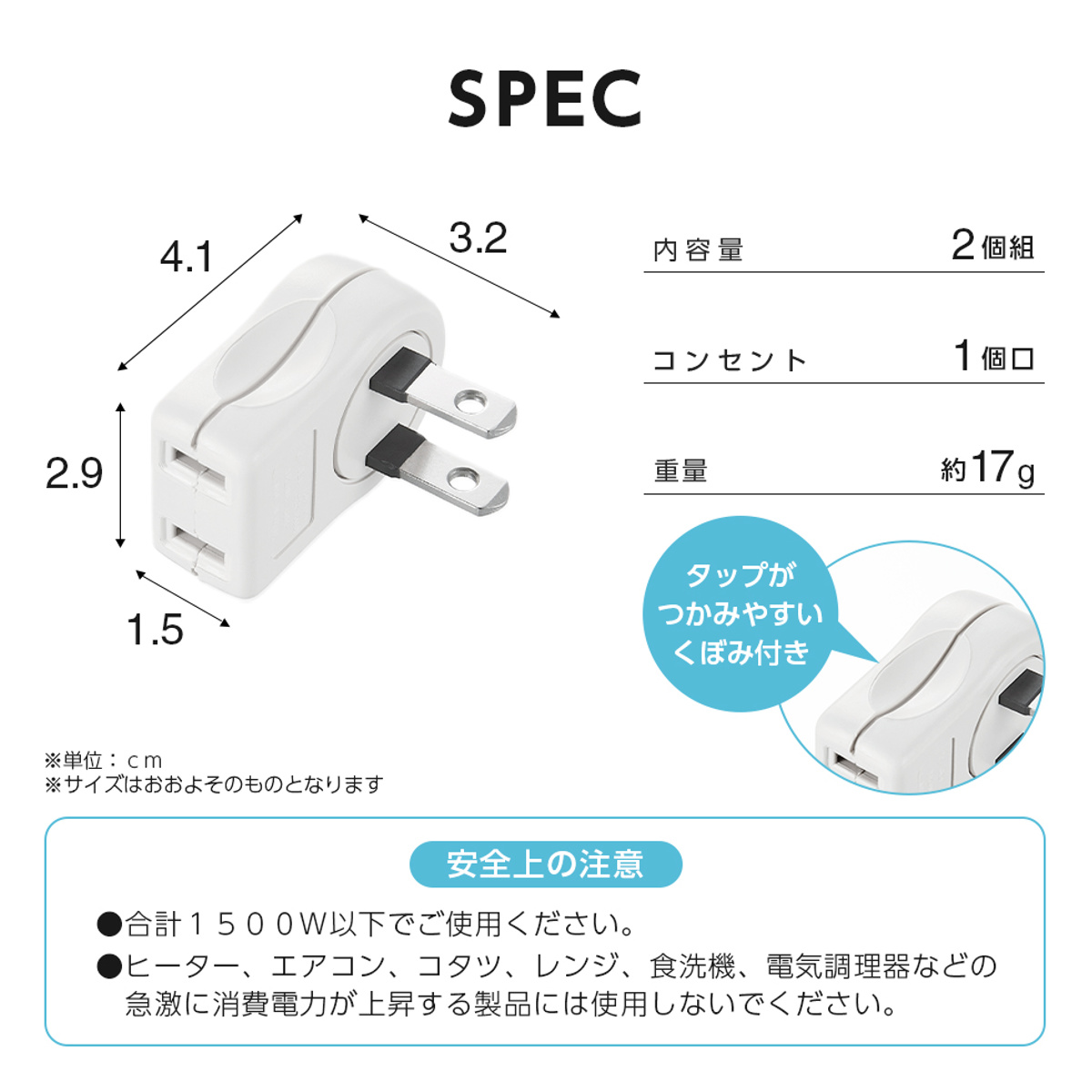 | 注意事項 | ※1500W以下でご使用ください。 ※ヒーター、エアコン、コタツ、レンジ、食洗機、電気調理器などの急激に消費電力が上昇する製品には使用しないでください。 |