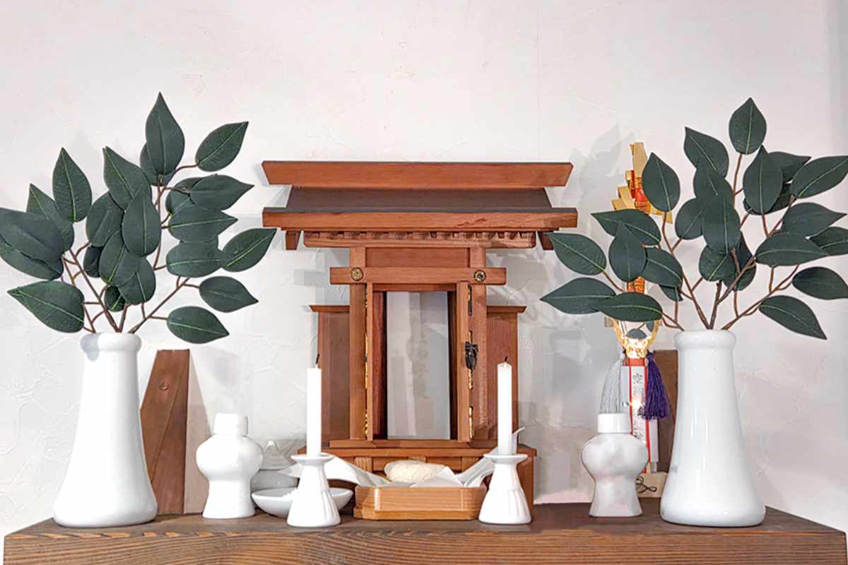 神棚にお供えする造花のサカキです。お手入れいらずで枯れる心配がなく、神棚を清らかな雰囲気に保てます。植物が枯れやすい夏の時期や、旅行などで長期不在の際にもおすすめです。