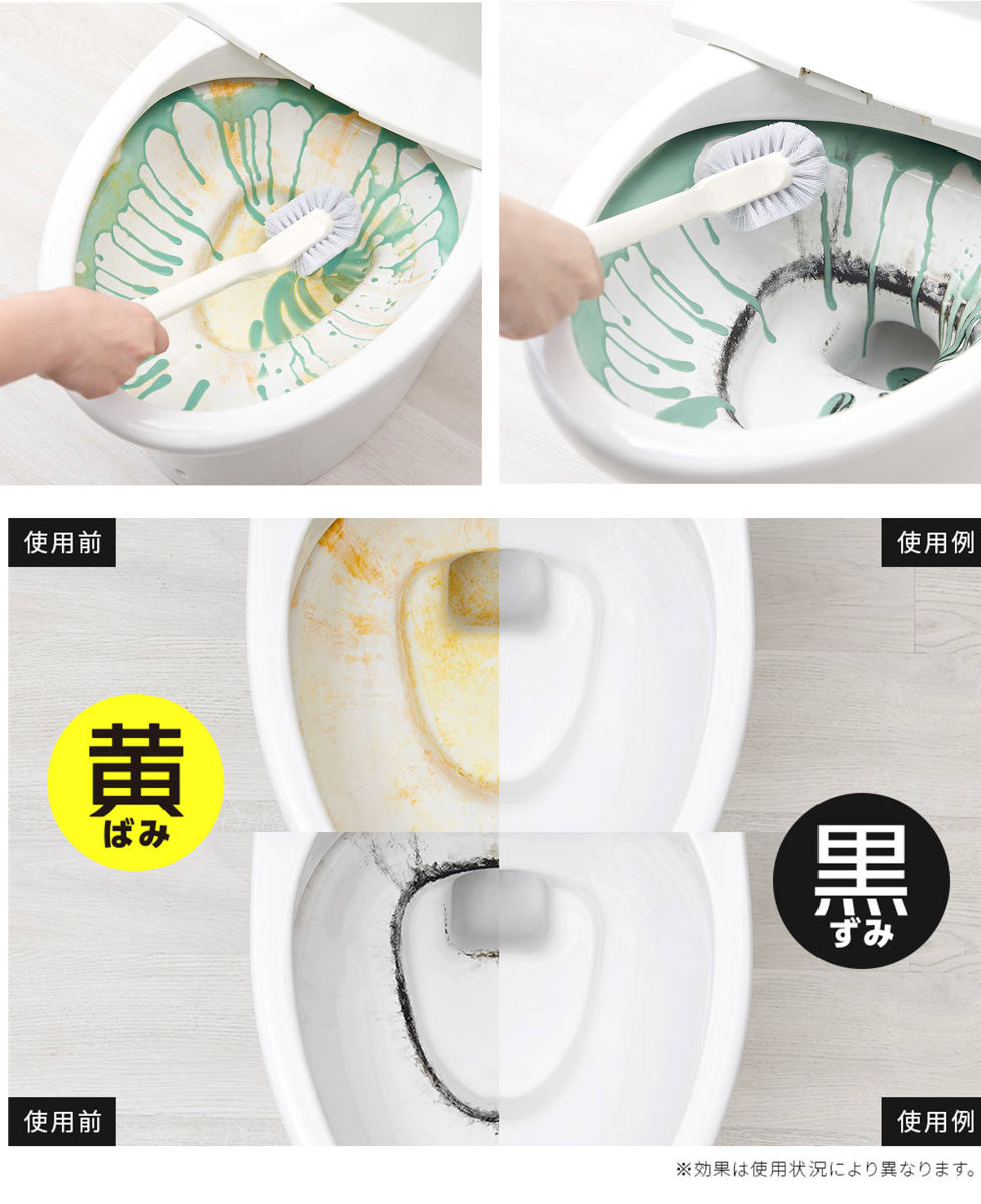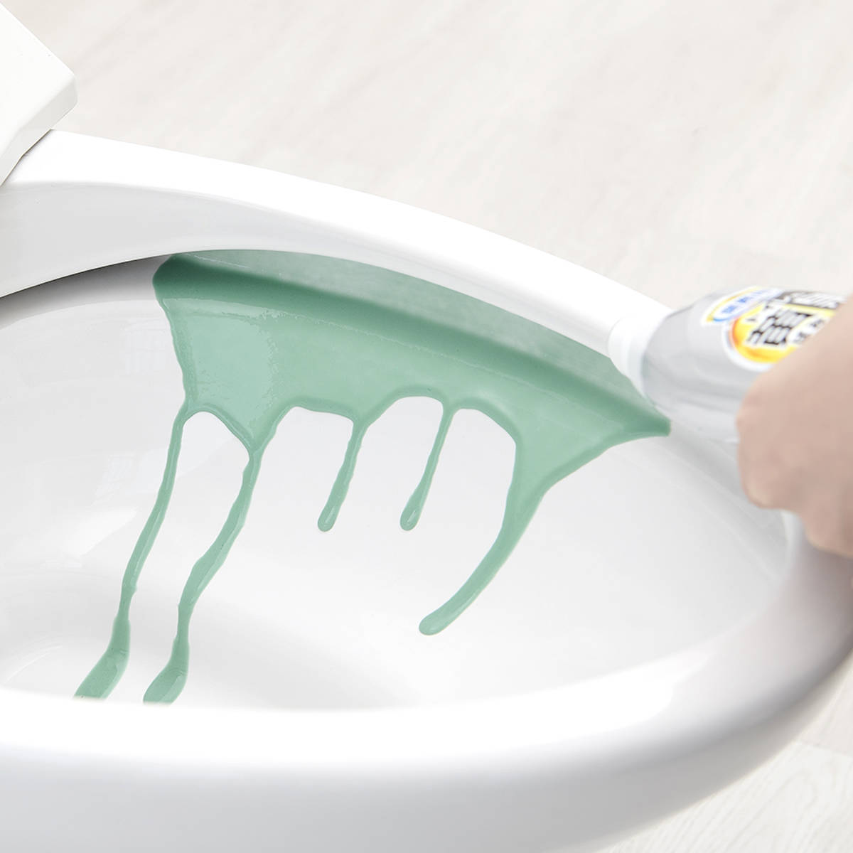 とろみのある洗浄液がフチ裏汚れにしっかり密着。垂れにくく飛び散りにくい粘性タイプです。逆さに使えるボトルで塗布しやすく、見えやすいグリーン色の洗浄液が塗り残しを防ぎます。