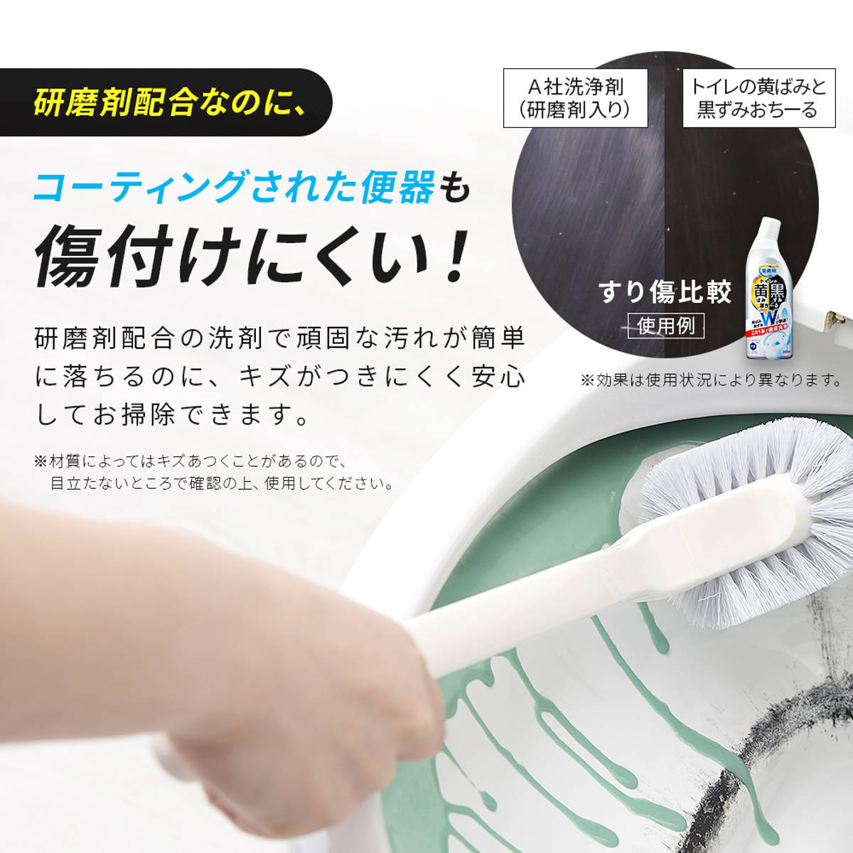 研磨剤配合で頑固な汚れを落としながらも、コーティングされた便器にもキズがつきにくい設計。一般的な研磨剤入り洗剤と比べ、すりキズが目立ちにくく、日常使いから念入りなお掃除まで幅広く対応します。