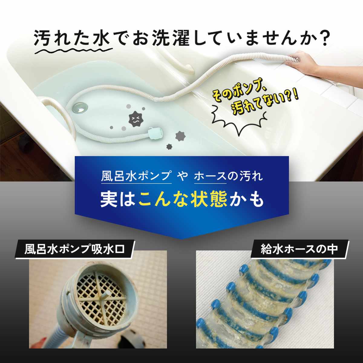 一見きれいに見える風呂水も、給水ポンプやホースの中には、お風呂の残り湯に含まれる皮脂汚れやカビ汚れが少しずつ蓄積しています。洗浄せずに使い続けると、その汚れを含んだ水で洗濯している可能性もあります。