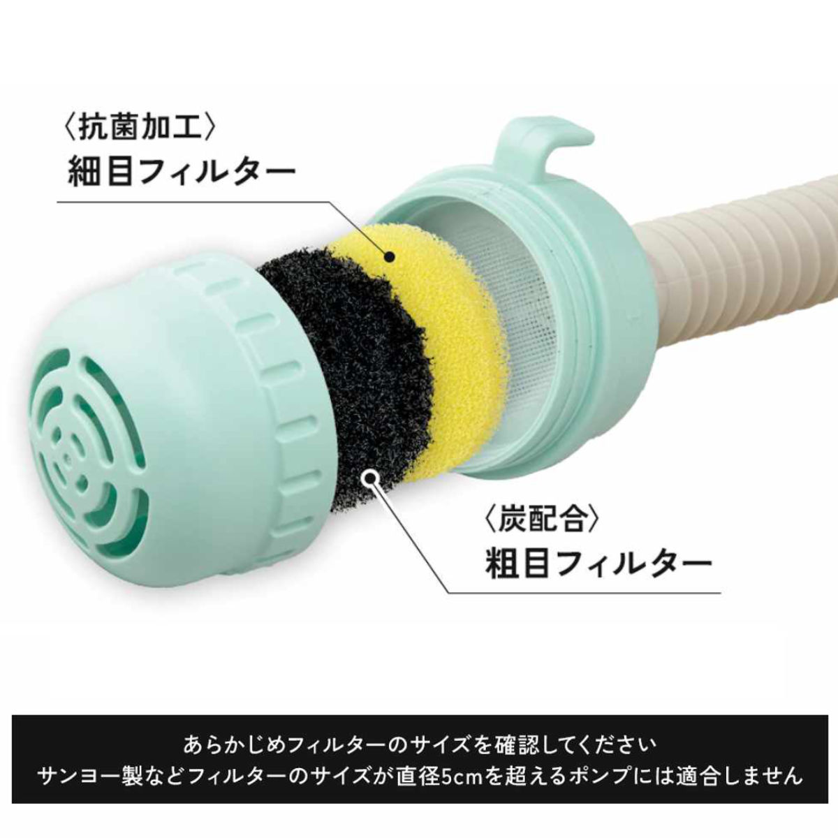 サンヨー製など、フィルター直径が5cmを超える給水ポンプには適合しません。