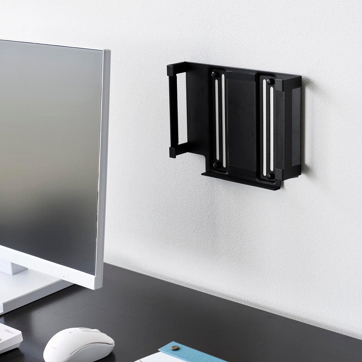 対応する小型PCを、モニター背面・デスク下・壁面の3通りで収納できるラックです。モニター背面やデスク下に設置して、デスク上を広く使うことができます。