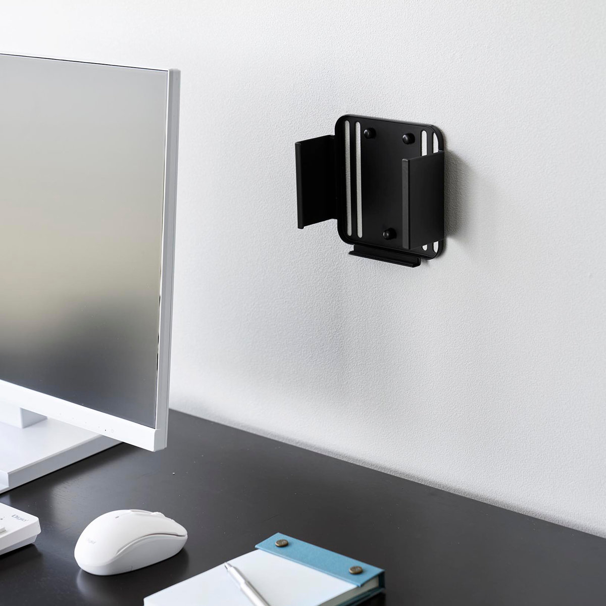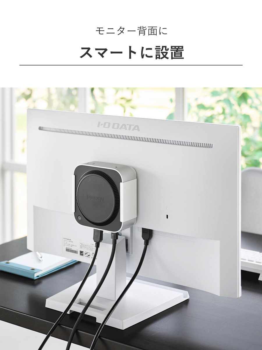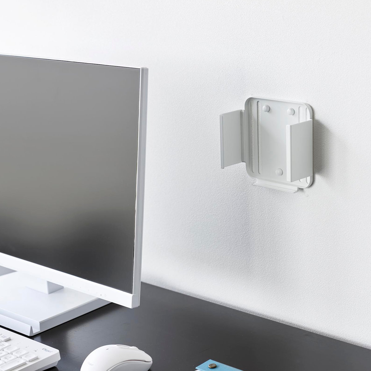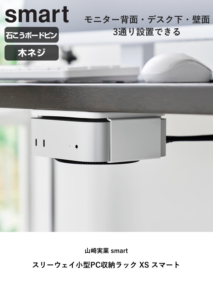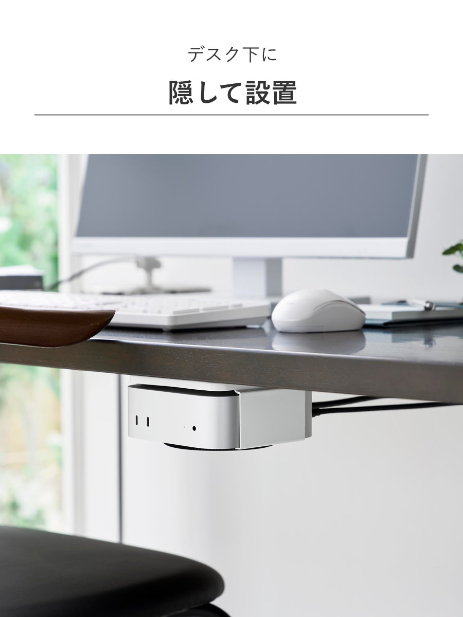 対応する小型PCを、モニター背面・デスク下・壁面の3通りで収納できるラックです。モニター背面やデスク下に設置して、デスク上を広く使うことができます。