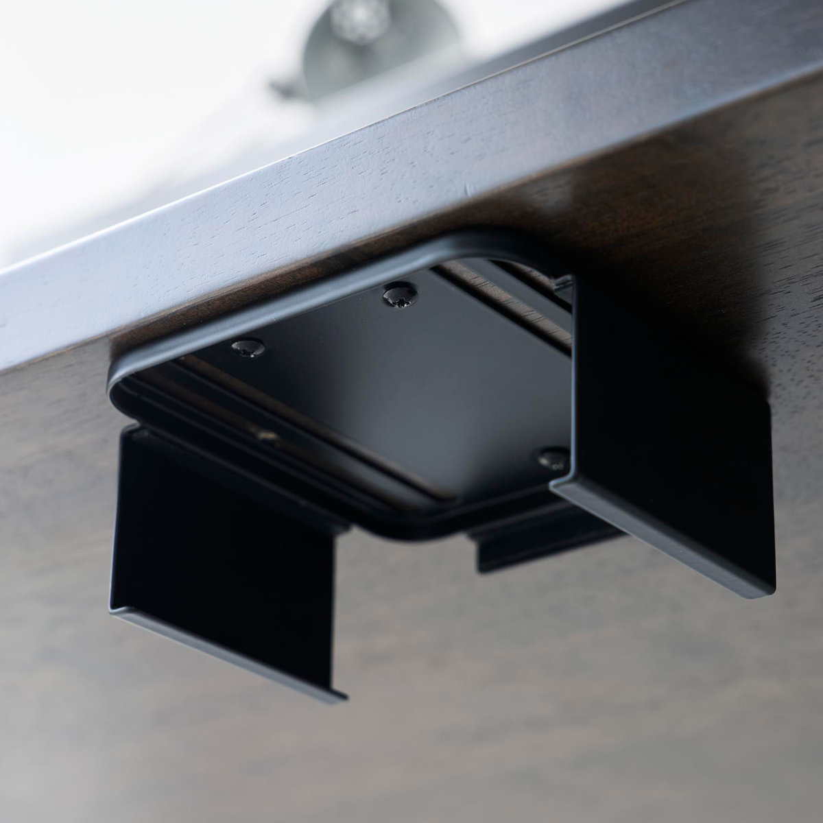 デスク下には木ネジでしっかり固定が可能です。小型PCをキズから守るクッション付きです。