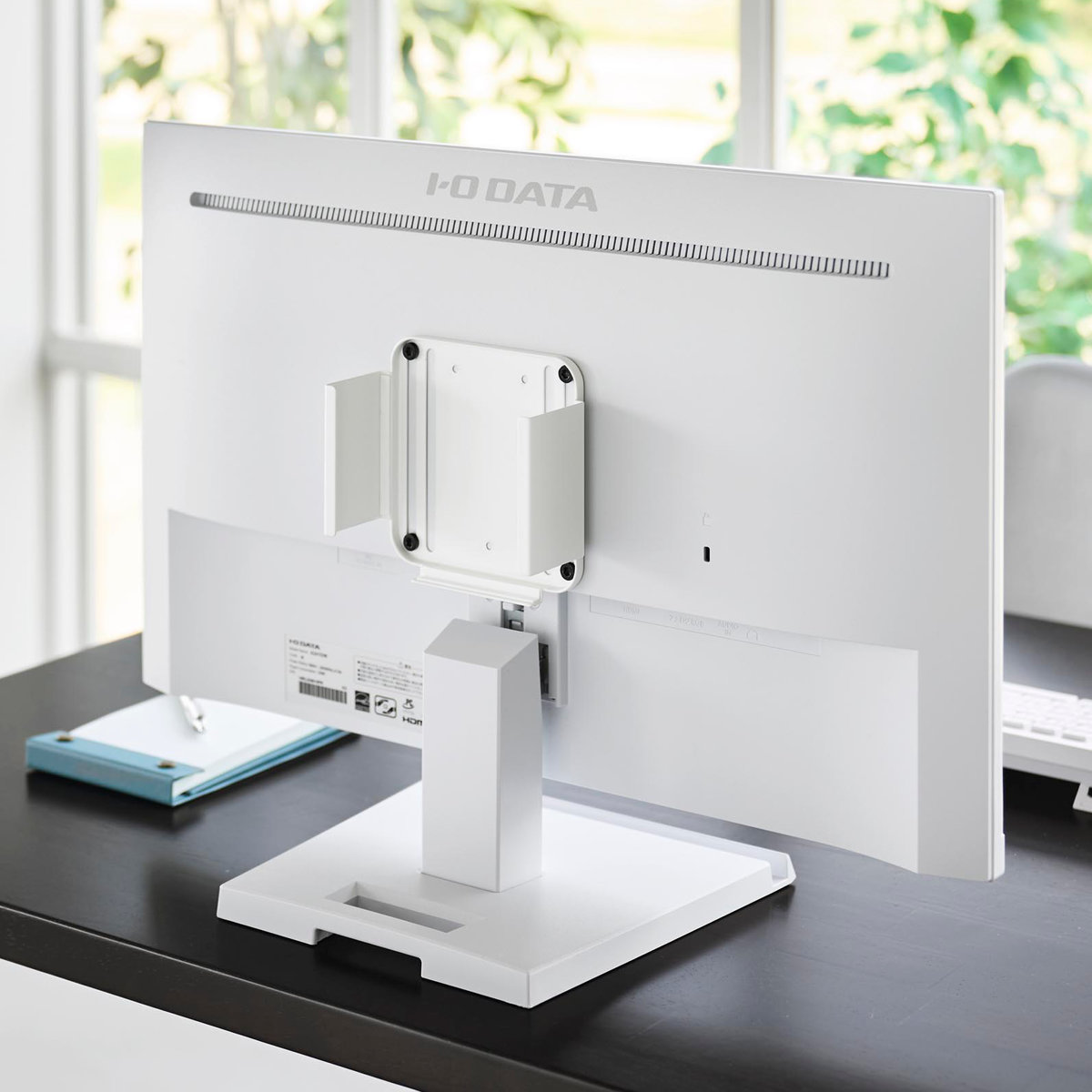 モニター背面のVESA規格ネジ穴に対応し、スリット穴によりモニターの支柱や配線を避けて取り付けることができます。