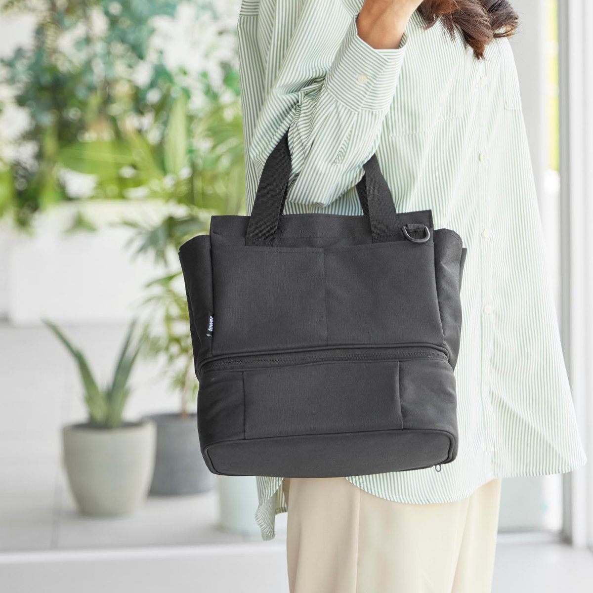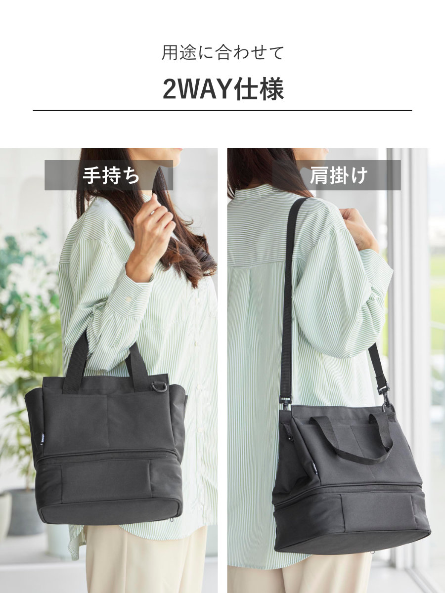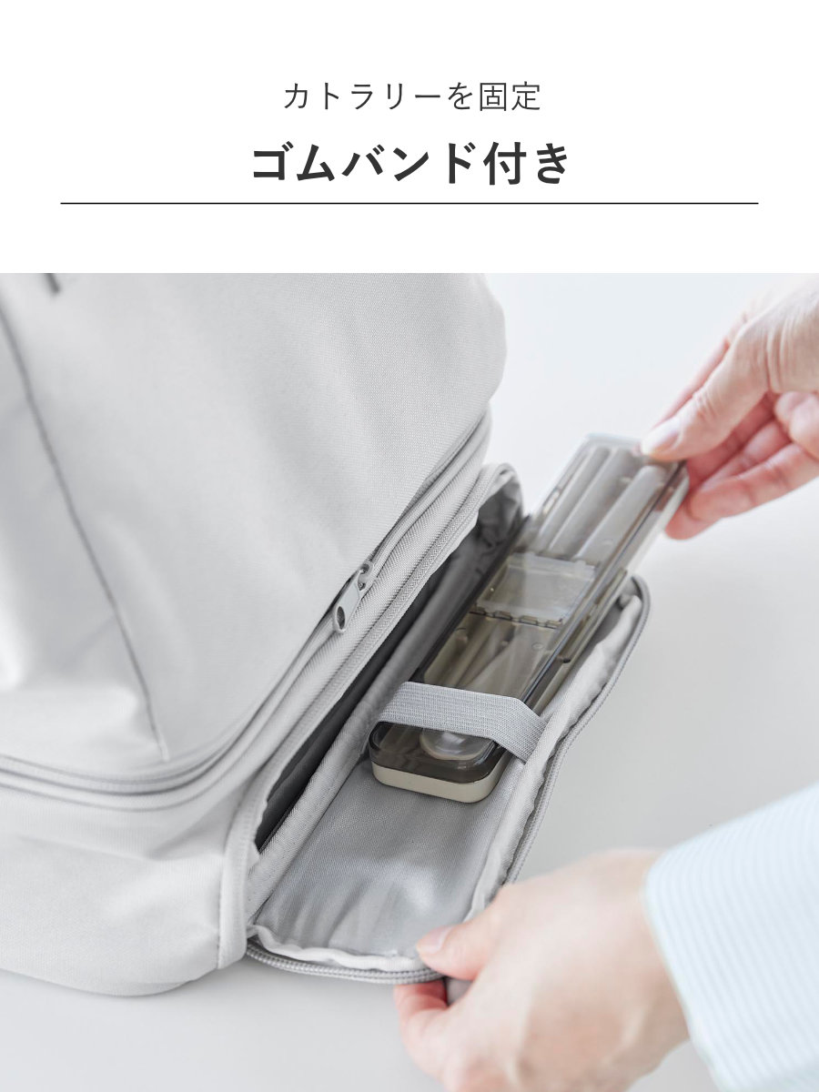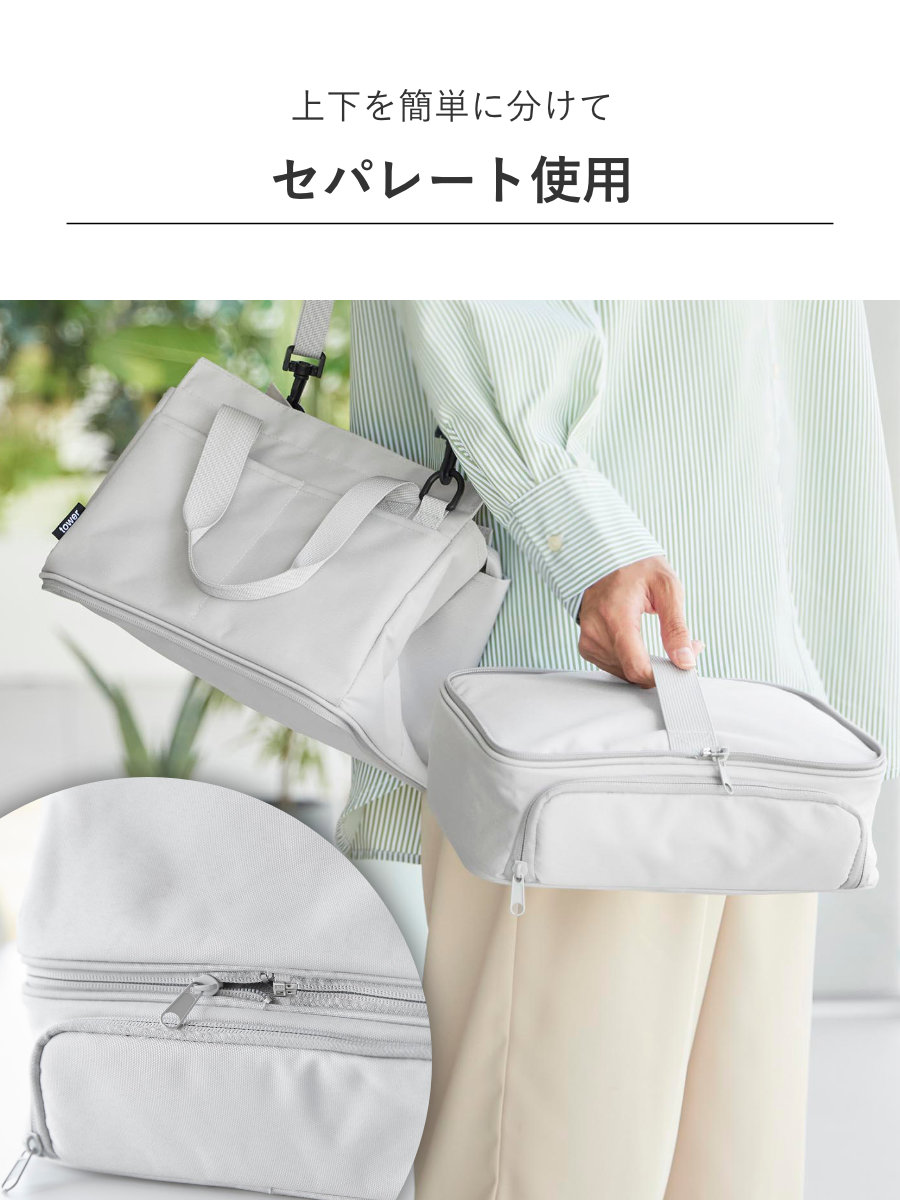 ファスナー仕様により、上下を簡単に分離でき、下段はランチバッグ、上段は普段使いのバッグとしても活躍します。