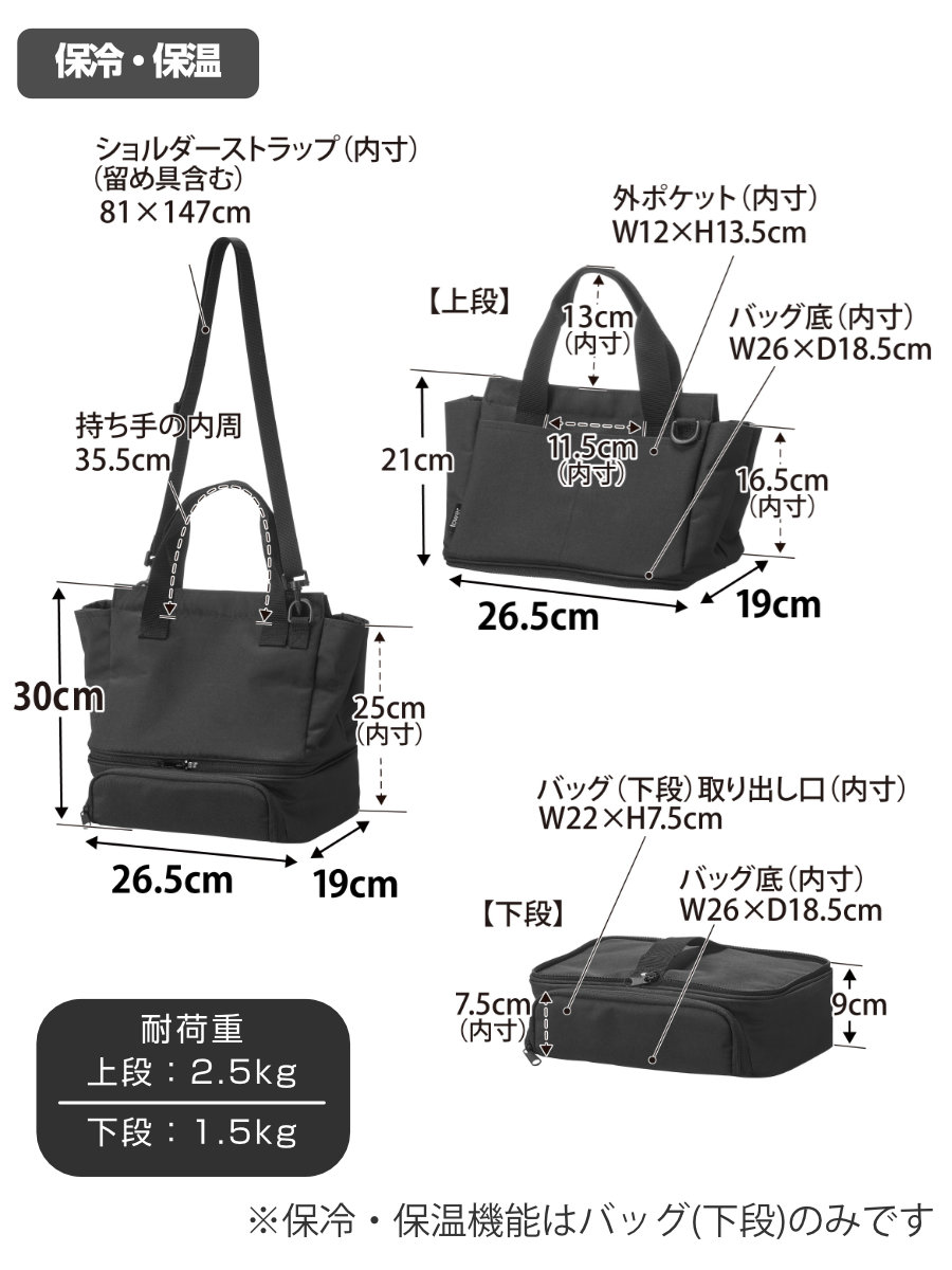 | サイズ | 約 幅26.5×奥行19×高さ30(cm) バッグ(上段):幅26.5×奥行19×高さ21cm バッグ(下段):幅26.5×奥行19×高さ9cm ショルダーストラップの長さ:81~147cm |