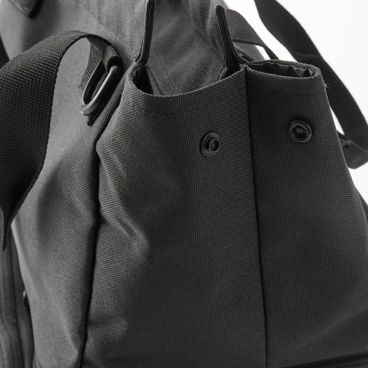 ファスナー付きで中身が見えず安心です。外ポケット2つ付きで小物も収納しやすく、サイドボタンでサイズ調整ができるため、シーンに合わせてスリムに使えます。