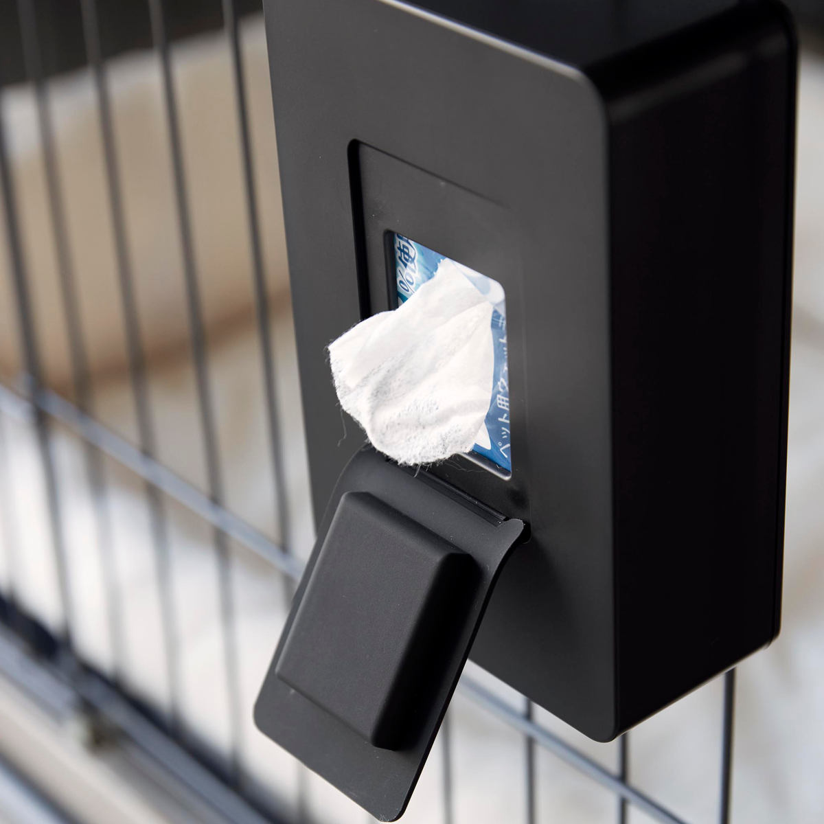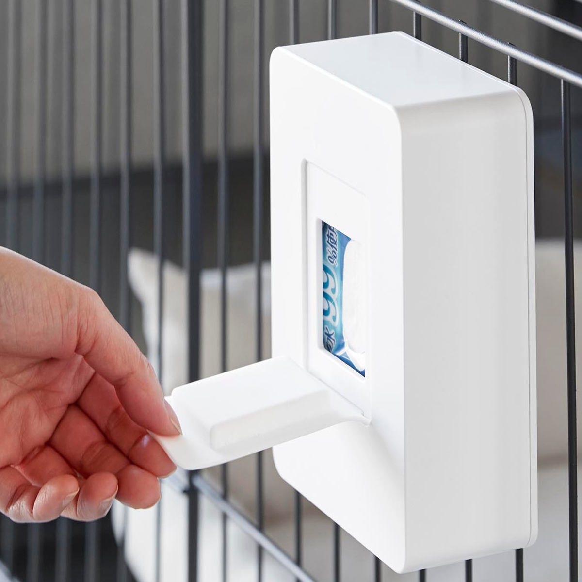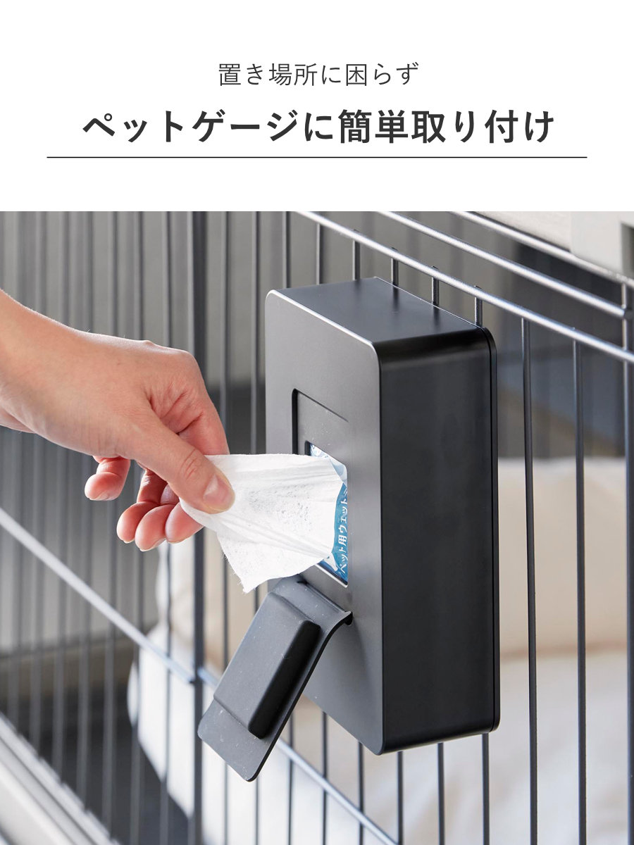 ペットケージの使いやすい場所に簡単に取り付けできるウェットティッシュケース です。横向き・縦向きどちらの向きでも設置でき、柵を利用して取り付ける場所や高さを自由に調節できます。シンプルなデザインでリビングにも自然に馴染みます。