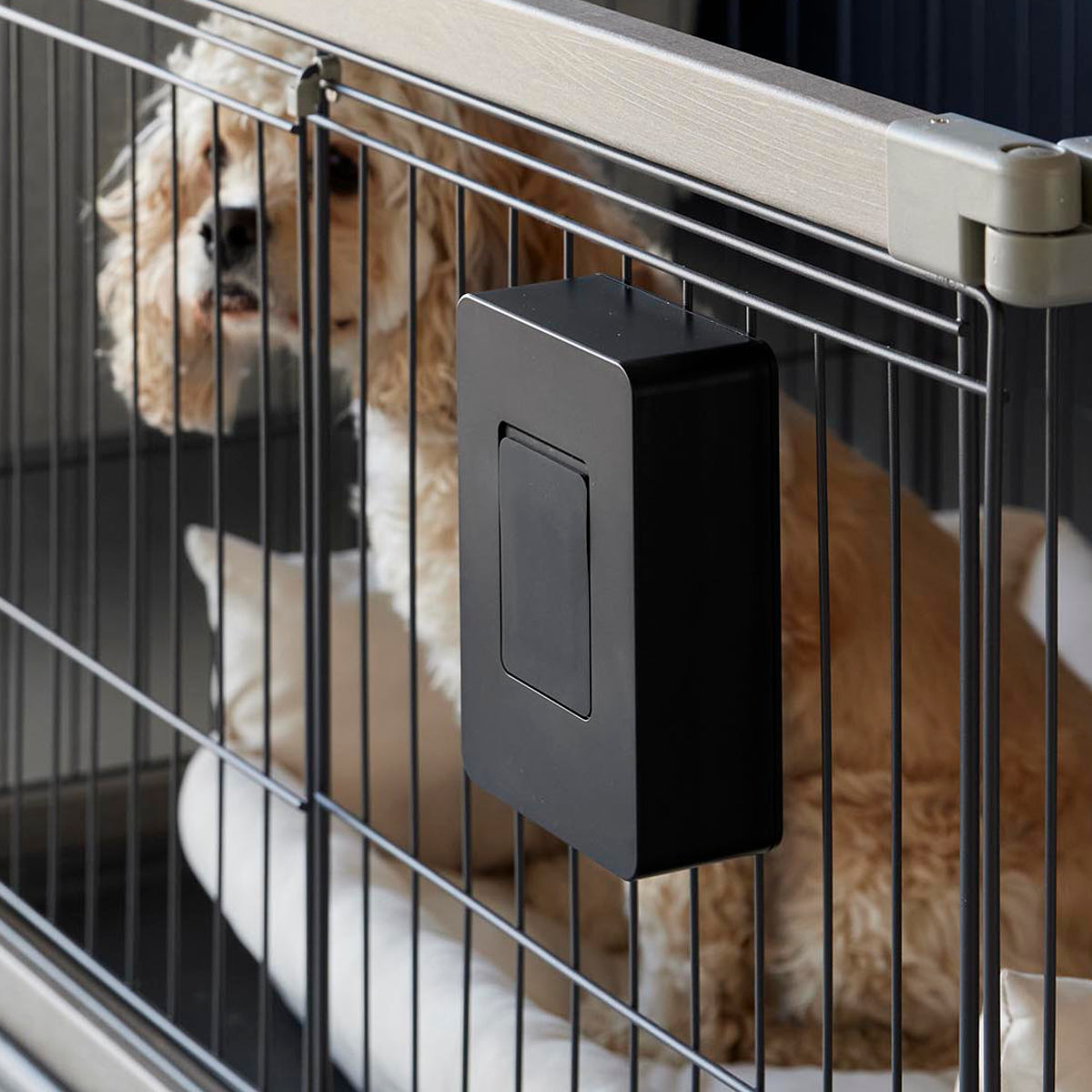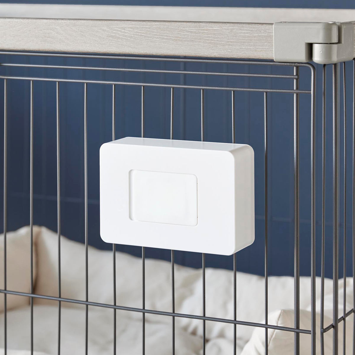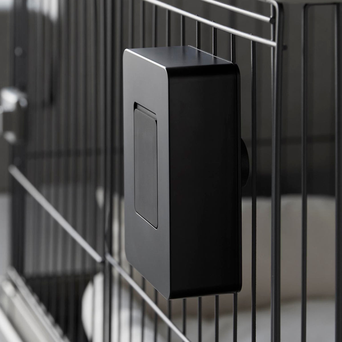 ペットケージの使いやすい場所に簡単に取り付けできるウェットティッシュケース です。横向き・縦向きどちらの向きでも設置でき、柵を利用して取り付ける場所や高さを自由に調節できます。シンプルなデザインでリビングにも自然に馴染みます。