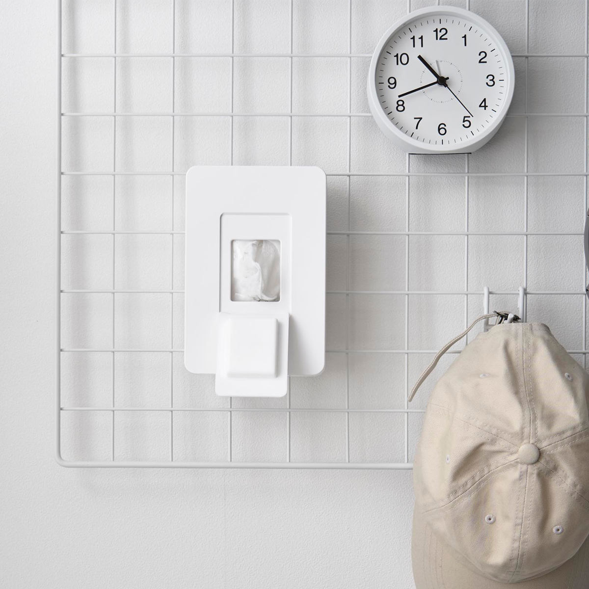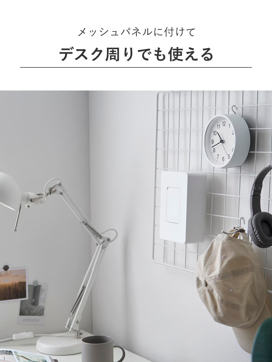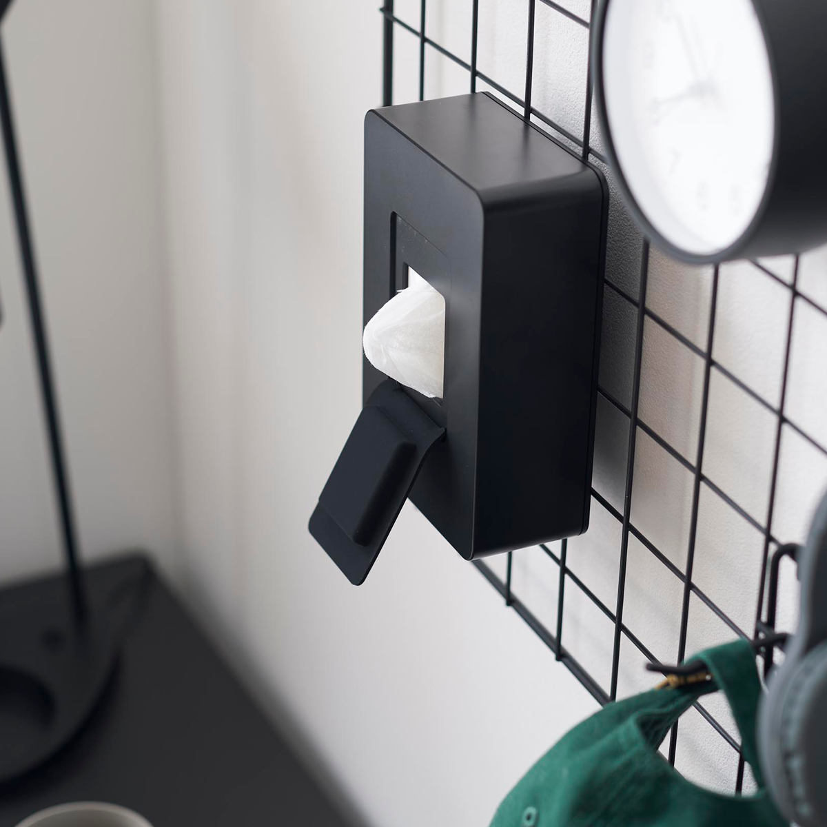 デスク周りでは、メッシュパネルなどにも取り付けが可能です。ウェットティッシュがあると嬉しい場所に手軽に取り付けて使用できます。