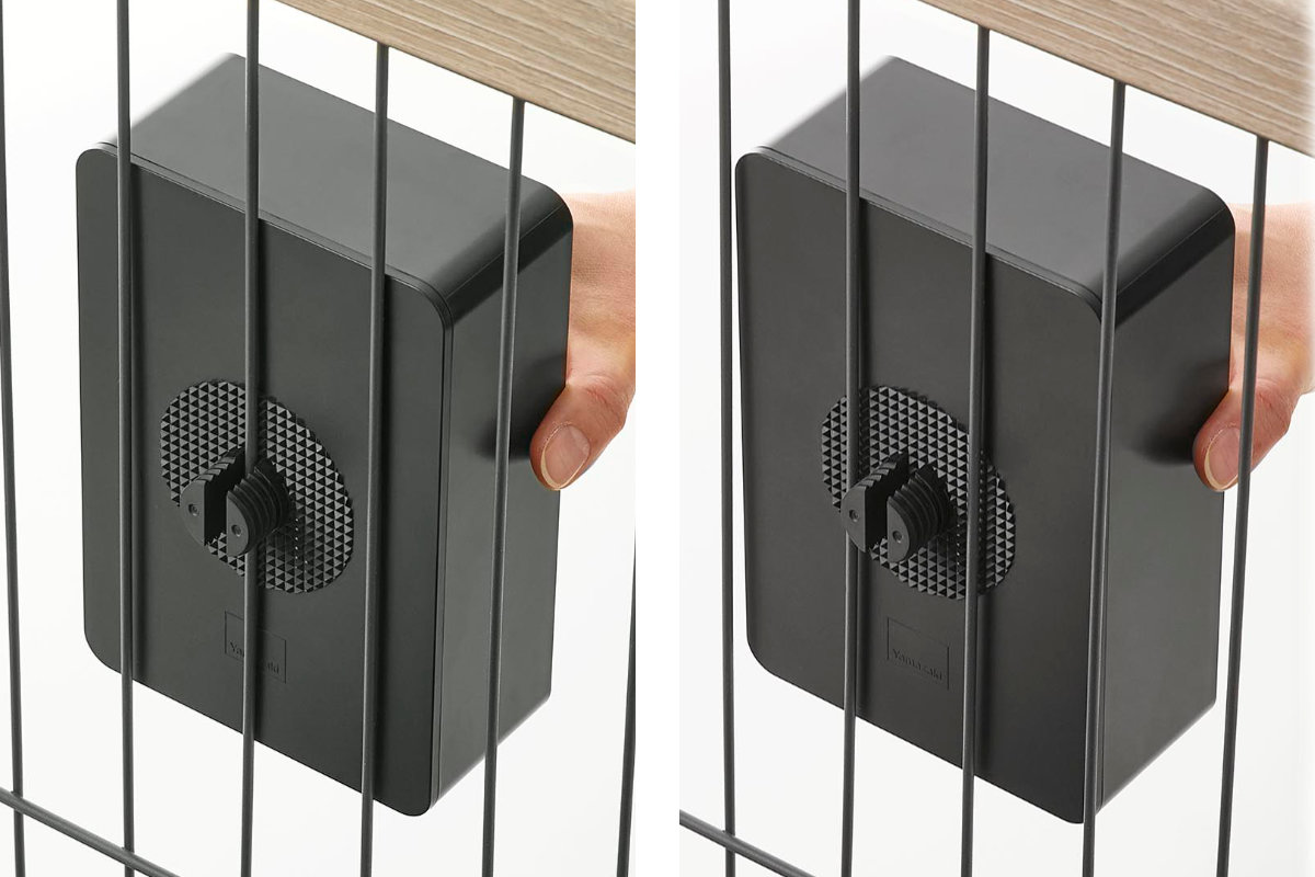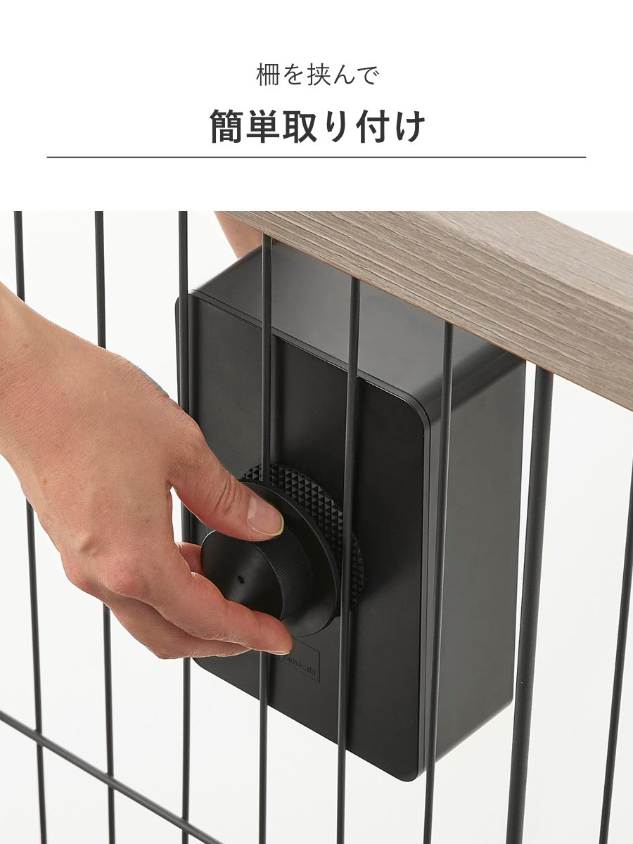 取り付けは、ベース部分とキャップで柵を挟んで固定するだけです。ゲージのワイヤーを取り付けベースの溝にはめ込むか、ワイヤーの間にベースをはめ込むか、お使いのゲージに合わせて取り付けられます。