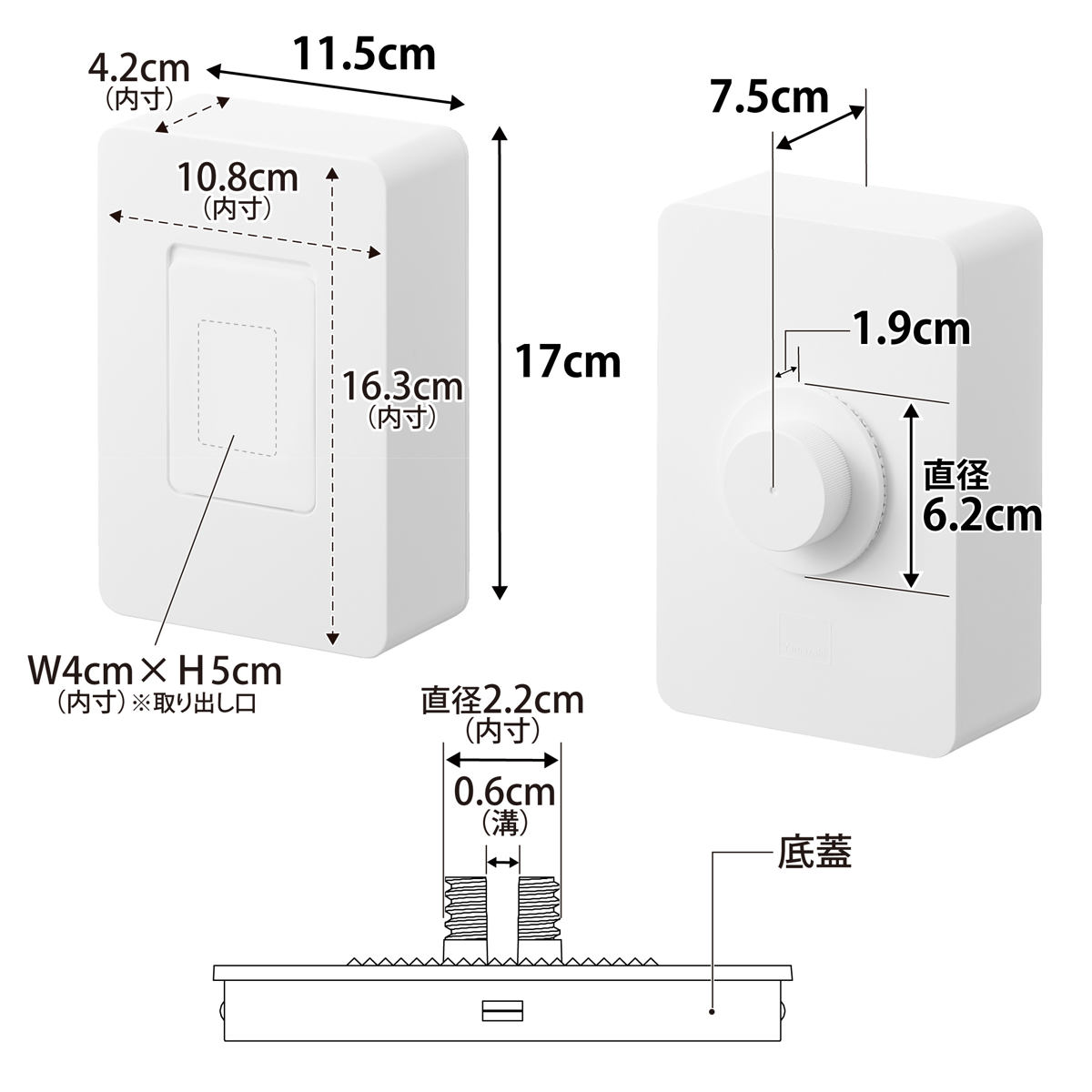 | サイズ | 約 幅11.5×奥行7.5×高さ17(cm) 【内寸】 本体:約 幅10.8×奥行4.2×高さ16.3(cm) 取り出し口:約 幅4×高さ5(cm) 取り付けベース:溝W0.6(cm)・ネジ部直径2.2(cm) 固定キャップ:約 直径6.2×奥行1.9(cm) |