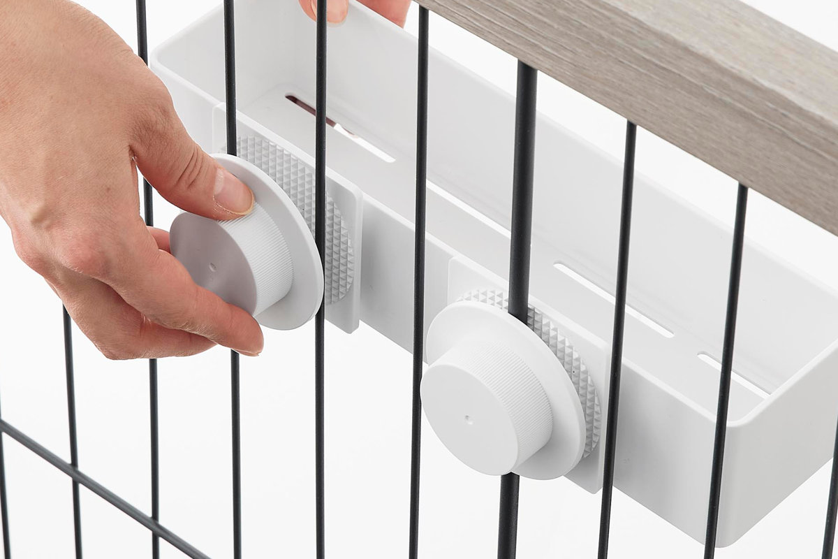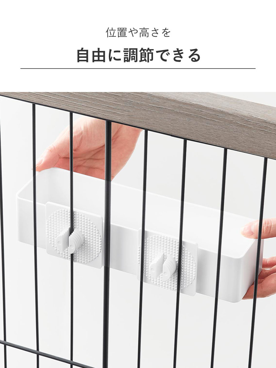 柵を利用して、取り付ける場所や高さを自由に調節できます。取り付けフックをキャップで挟み込むだけで簡単に固定できます。