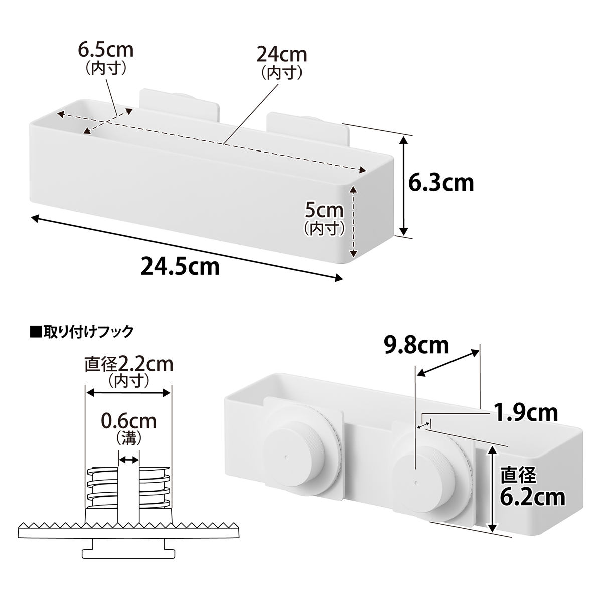 | サイズ | 約 幅24.5×奥行9.8×高さ6.3(cm) 収納部:約 幅24×奥行6.5×高さ5(cm) 取り付けフック:溝W0.6(cm)・ネジ部直径2.2(cm) 固定キャップ:約 直径6.2×奥行1.9(cm) |