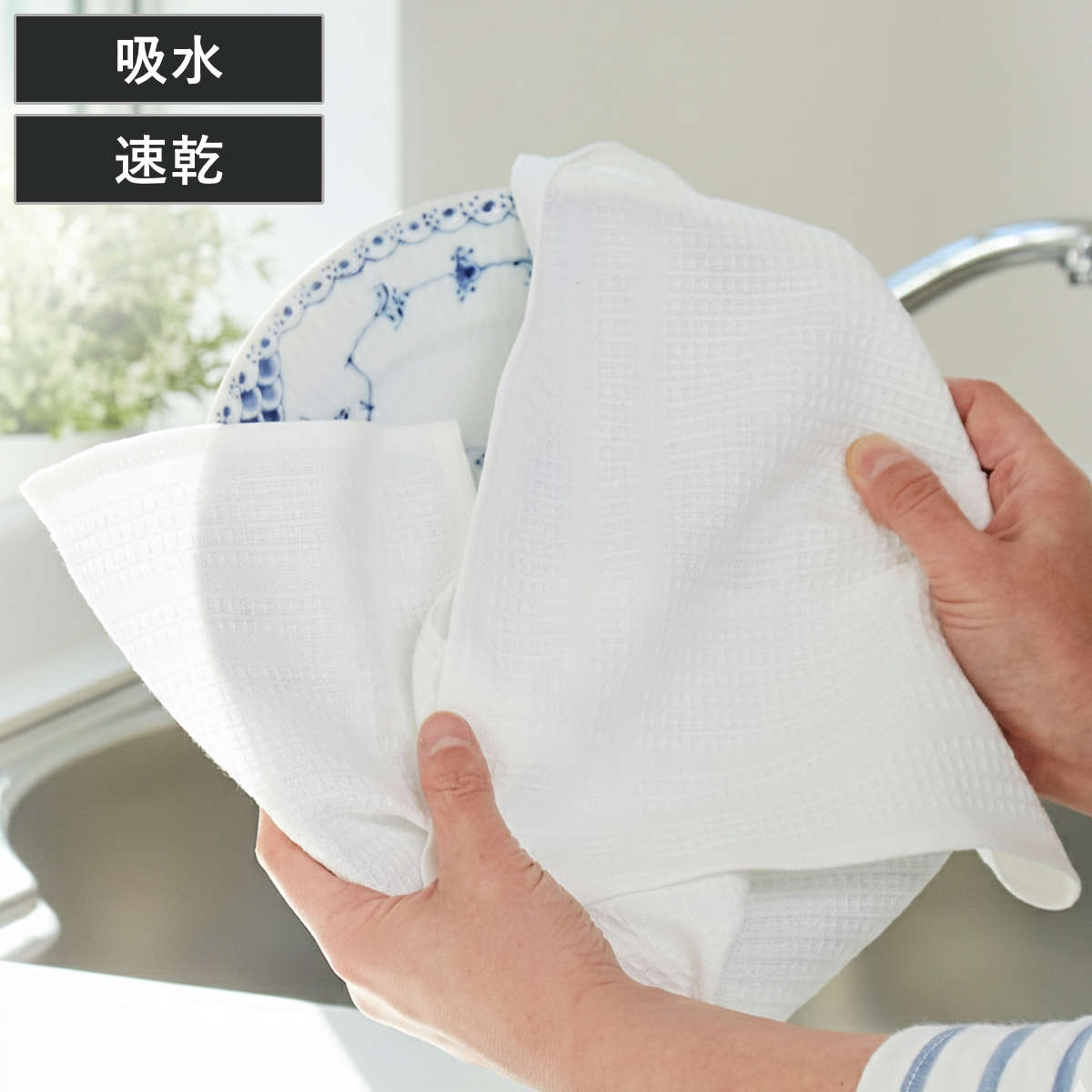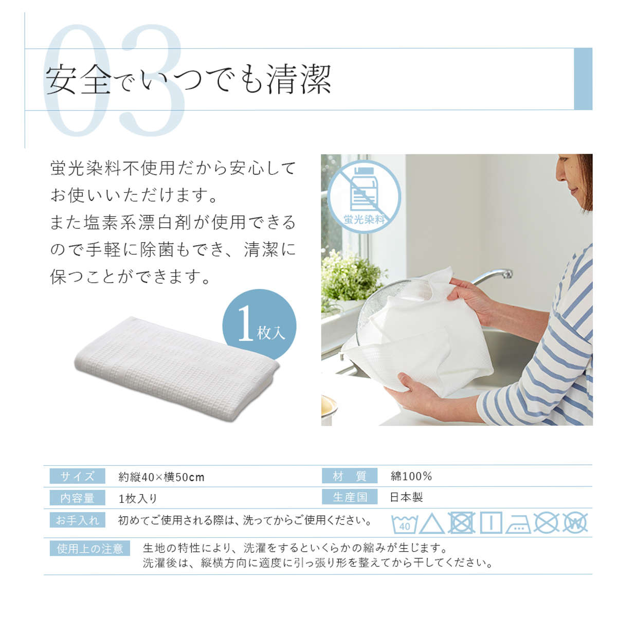 吸水性が高く乾きも早い、業務用にも使われている仕様のふきんです。凹凸のあるワッフル生地が水分をサッと吸い取り、拭き跡が残りにくいのも特長です。毎日のキッチン作業を快適にしてくれます。