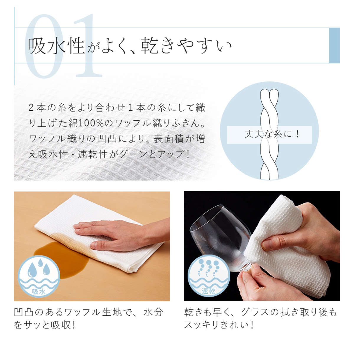 ●凹凸ワッフル生地が水分をサッと吸収し、高い吸水性を発揮します。