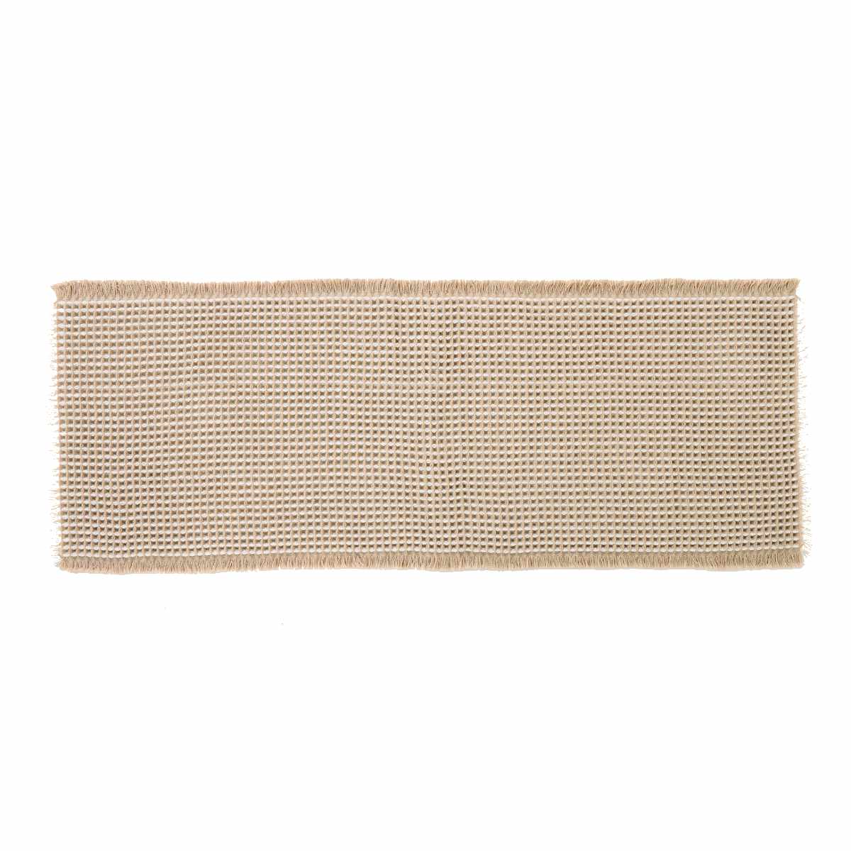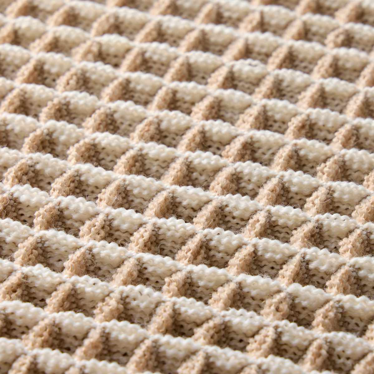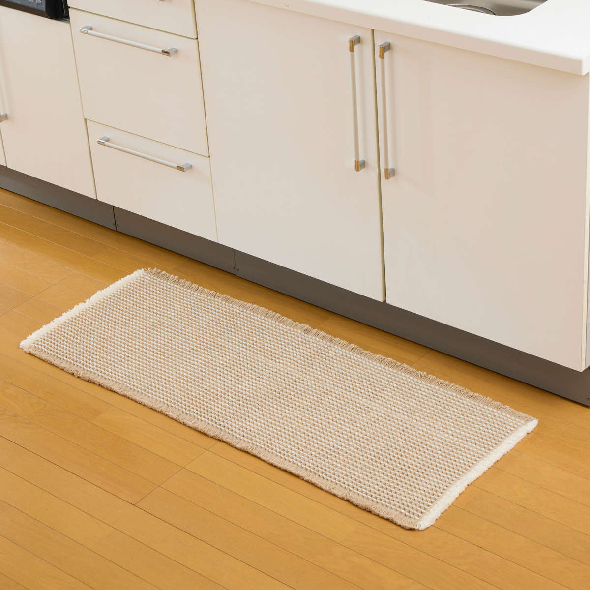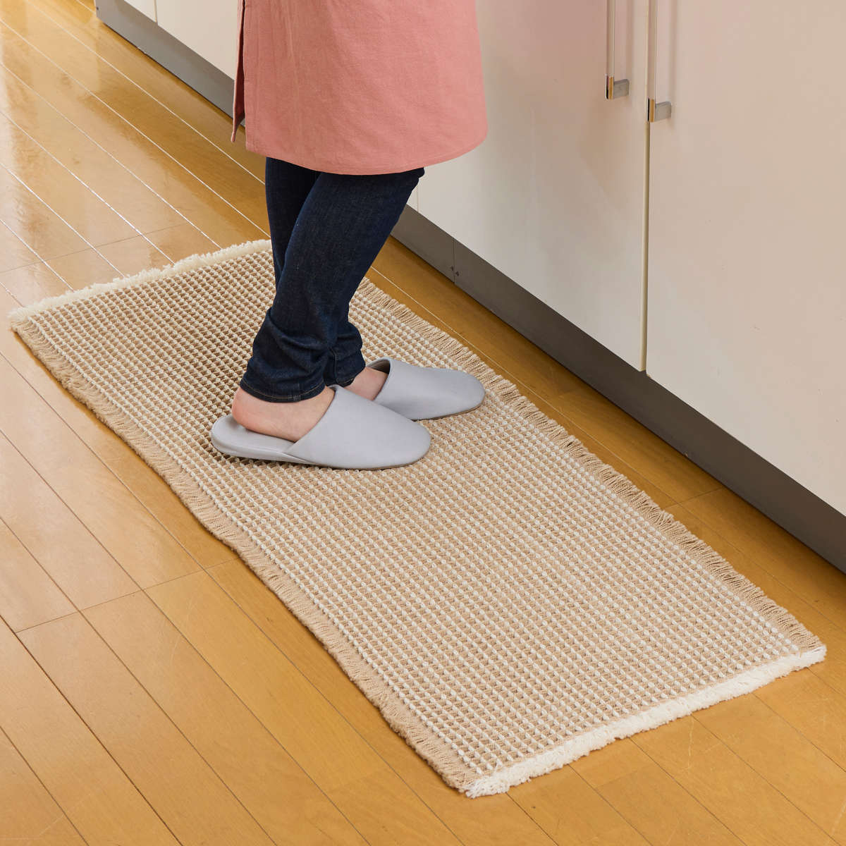 厚さ約1cmの厚手ワッフル織りで、踏んでも弾力がありへたりにくい仕様です。立体的な凹凸が空気の層をつくり、通気性が良く水滴も素早く吸収。キッチン使いにぴったりの快適なマットです。