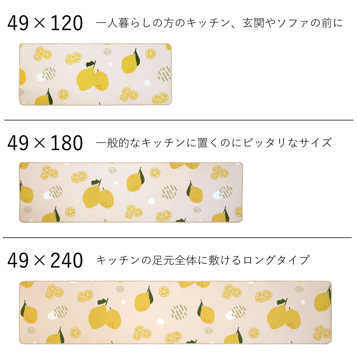 ●49×180cm・・・一般的なキッチン・ベッドサイド、ソファ前。
