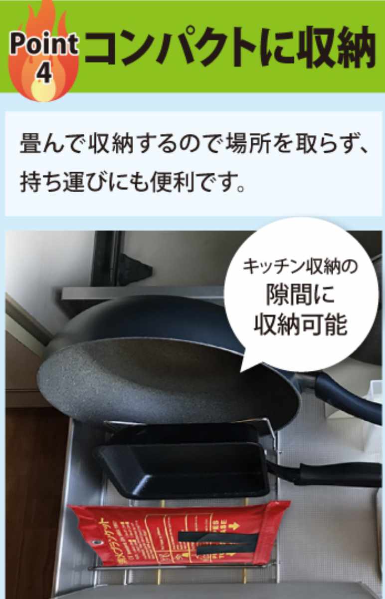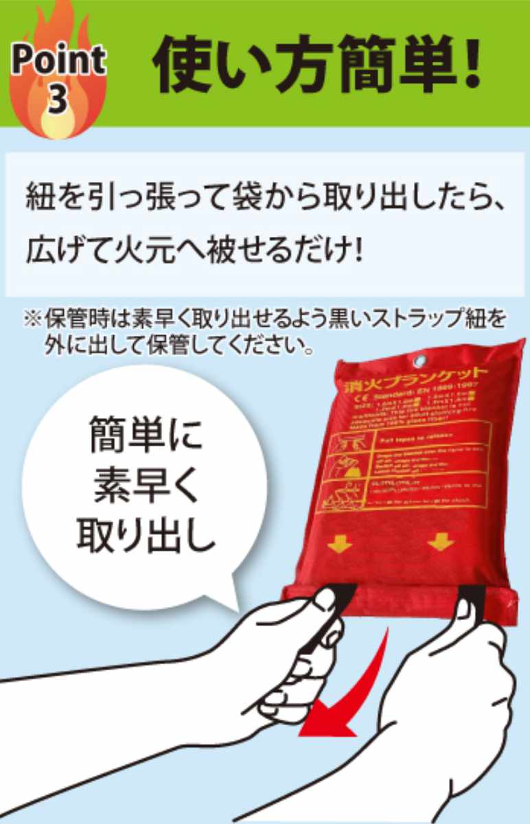 ●いざというときの火災対策として備えておきたい消火ブランケットです。