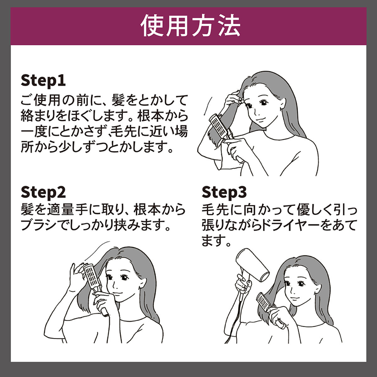 STEP1:使用前に髪をとかし、絡まりをほぐします。根元から一度にとかさず、毛先に近い部分から少しずつ行ってください。