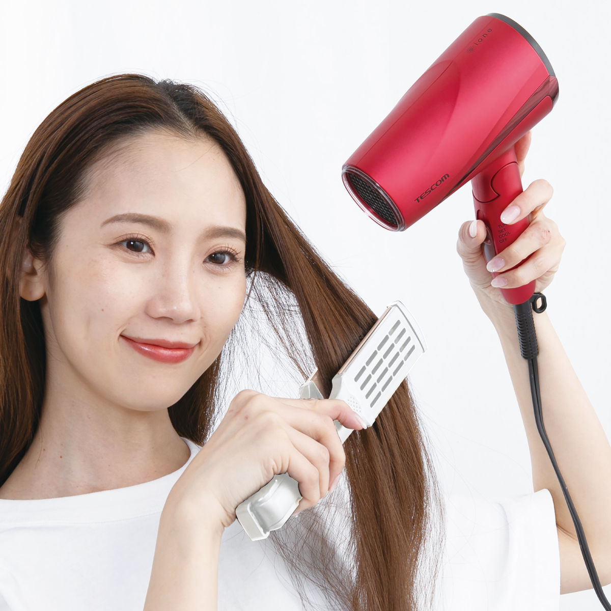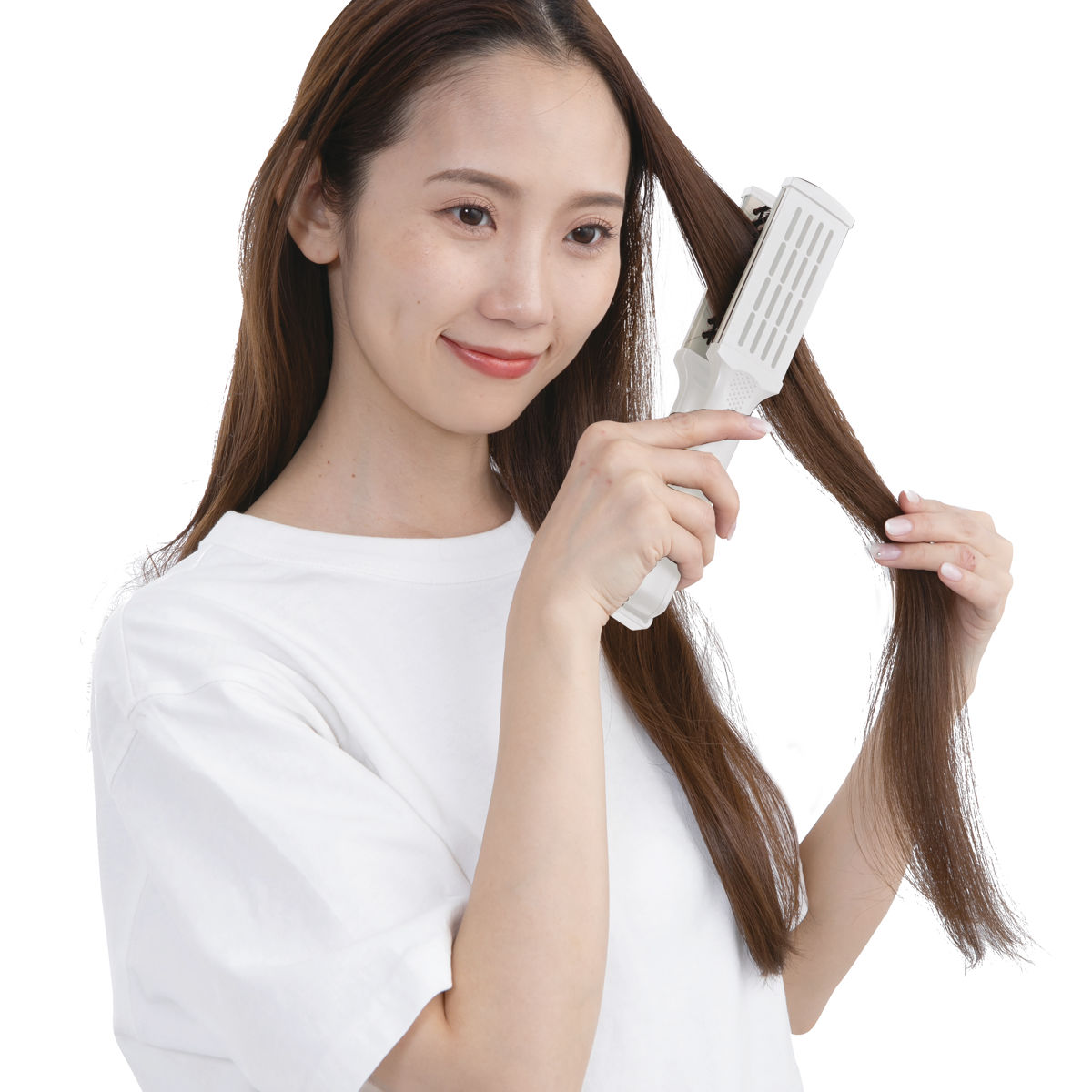 ●髪を挟んで毛先へ伸ばすだけで、自然なストレートに整えます。