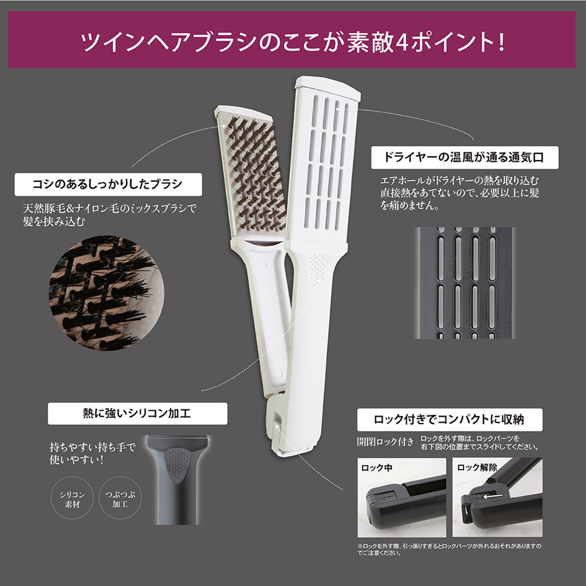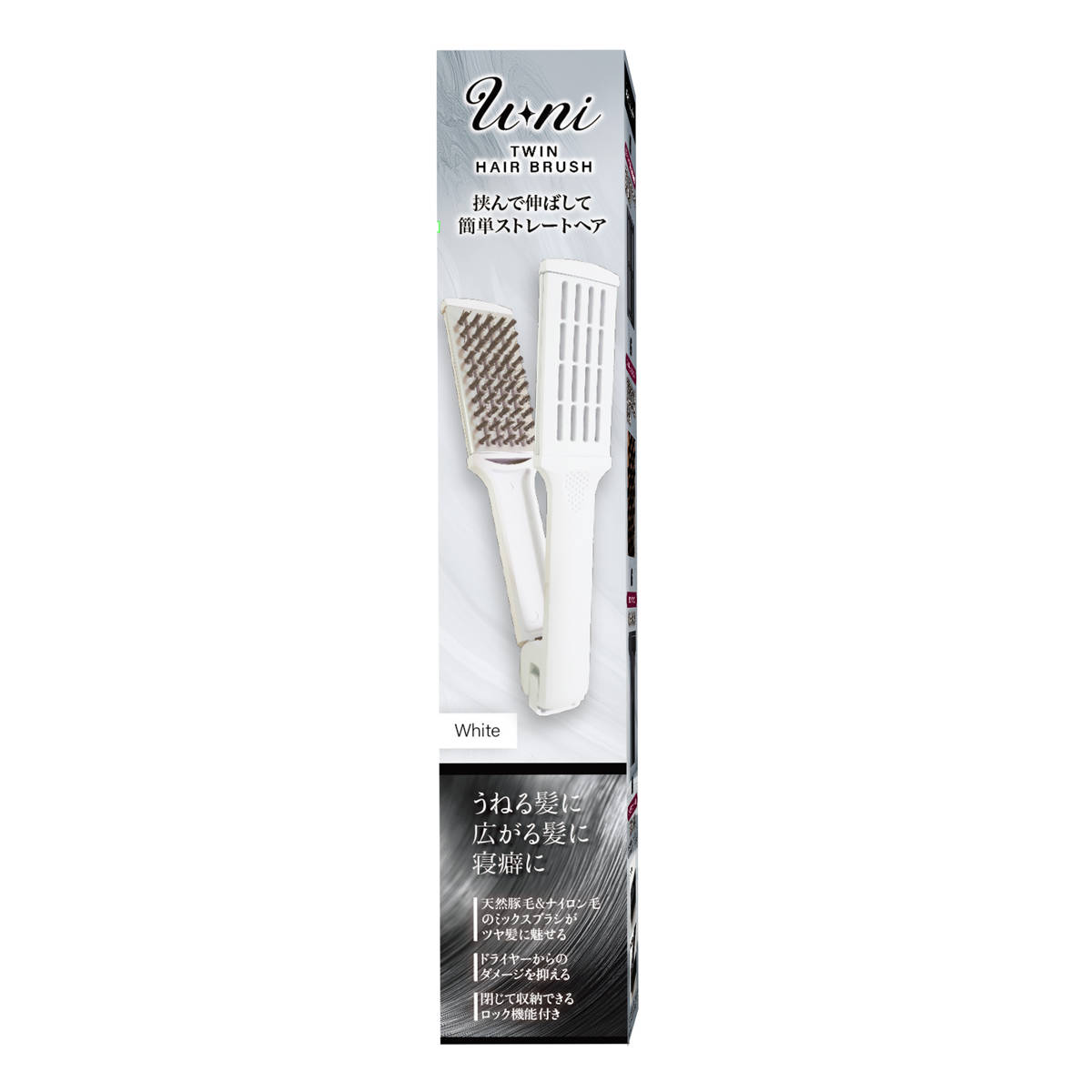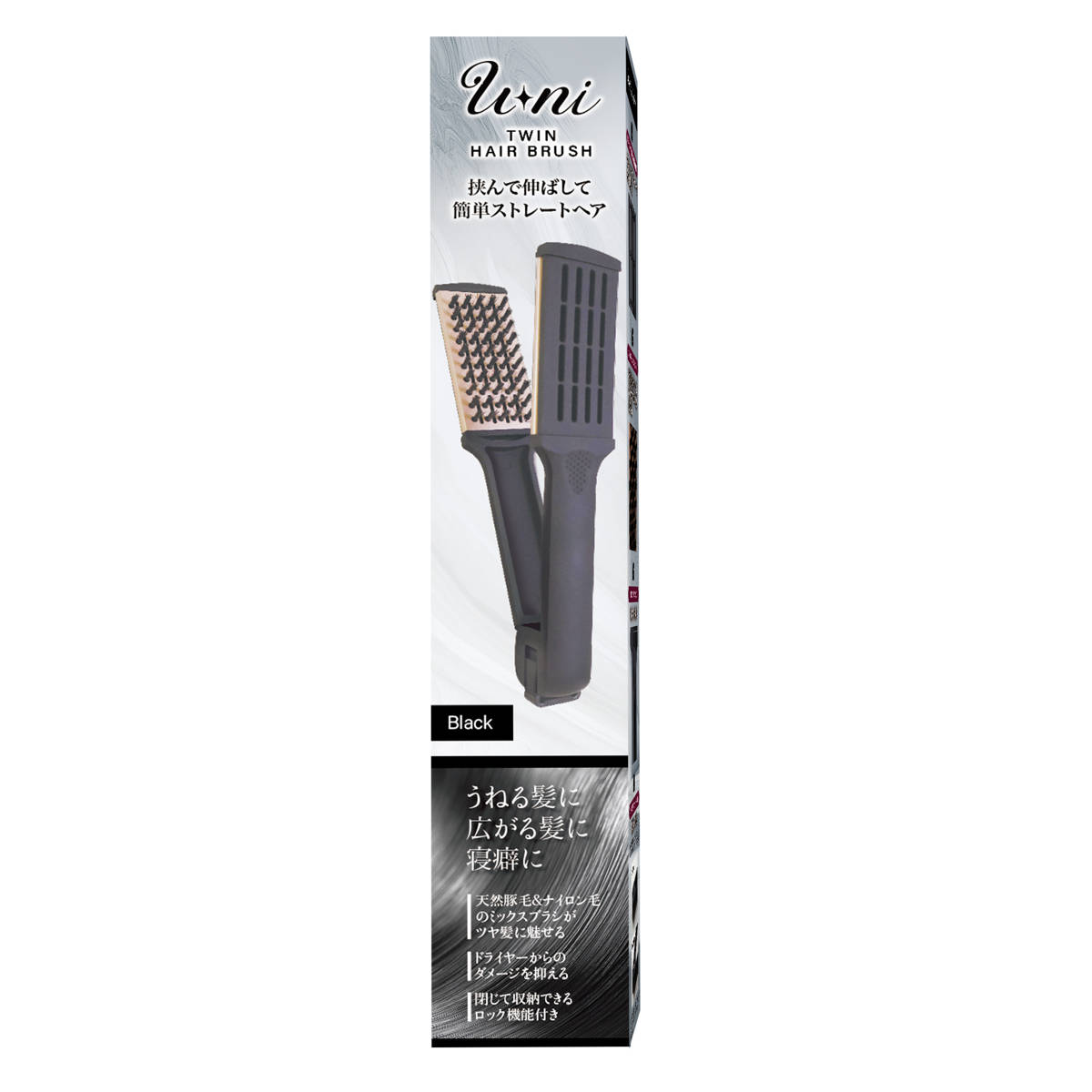 ブラッシング感覚で、艶やかなツヤ髪に仕上がるツインヘアブラシです。2枚のブラシで髪を挟み、毛先へ向かってゆっくり伸ばすだけで、自然なストレートヘアに整えます。うねる髪・広がる髪・寝癖など、毎日のヘアケアからスタイリングまで幅広く使えます。