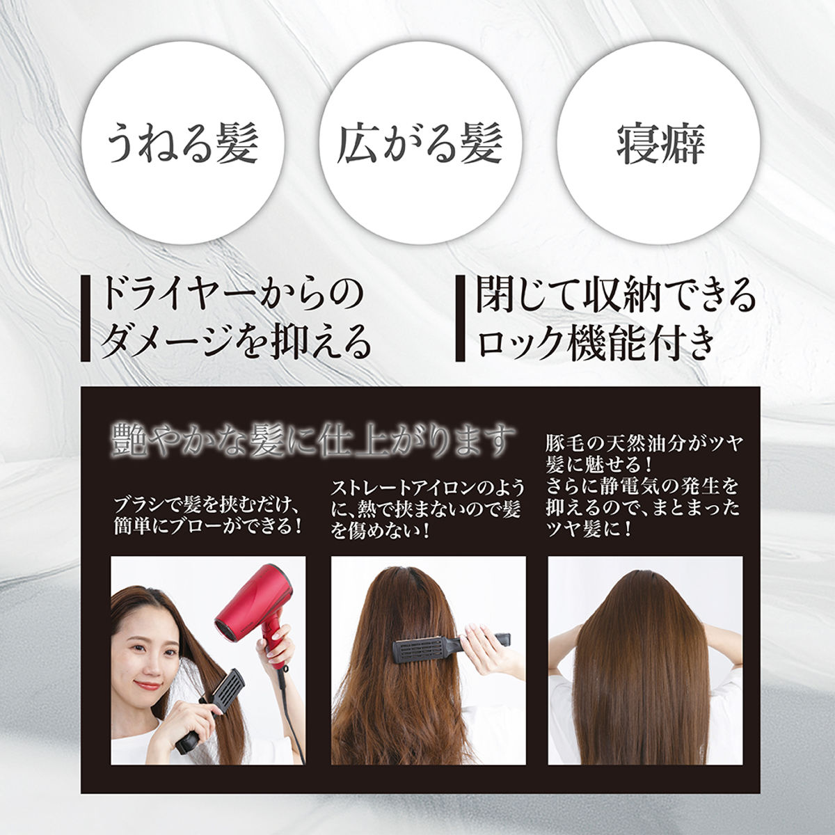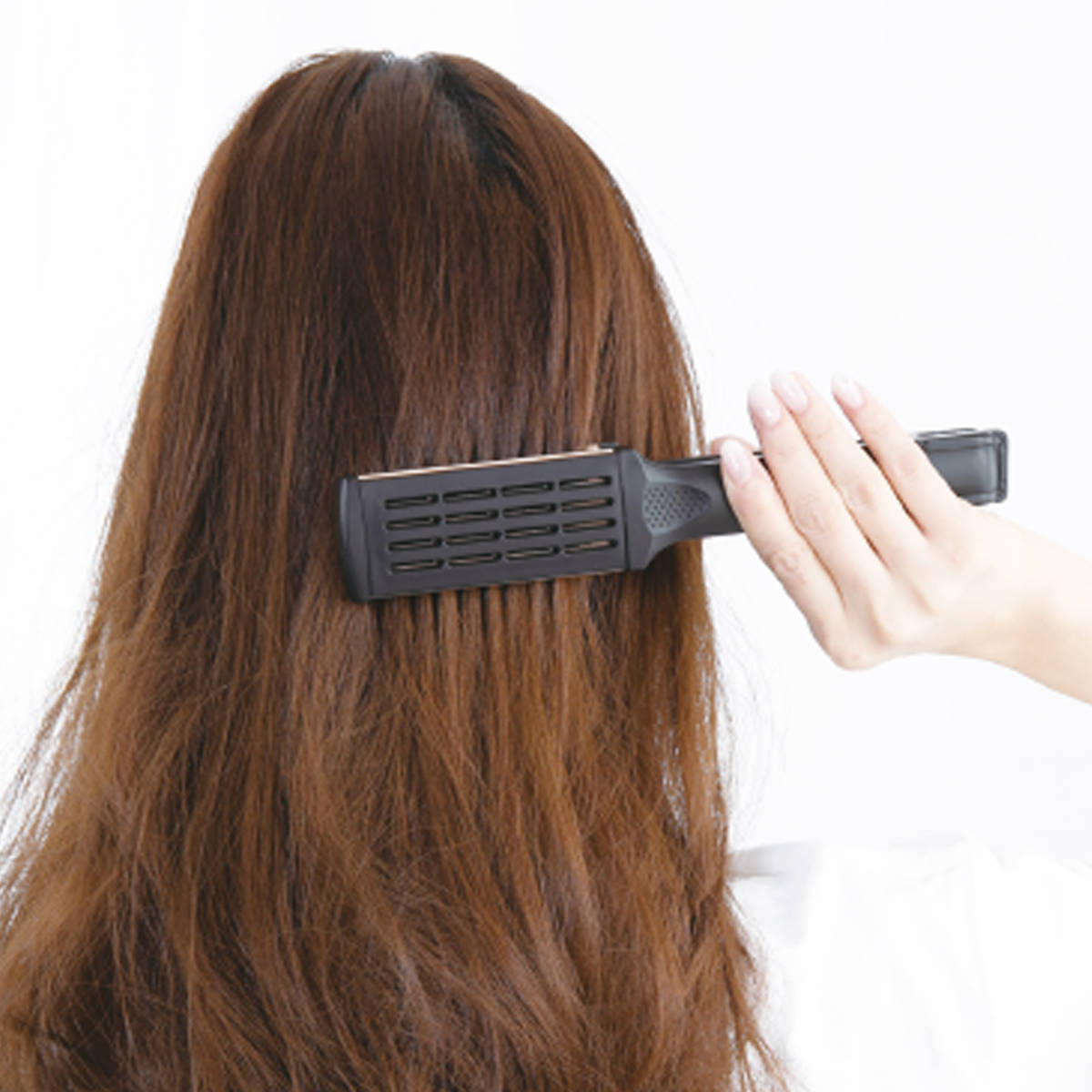 ストレートアイロンのように高温で挟まないため、髪への負担を抑えながらスタイリングできます。ドライヤーの風と熱を効率よく通し、うねり・広がり・寝癖を整えます。