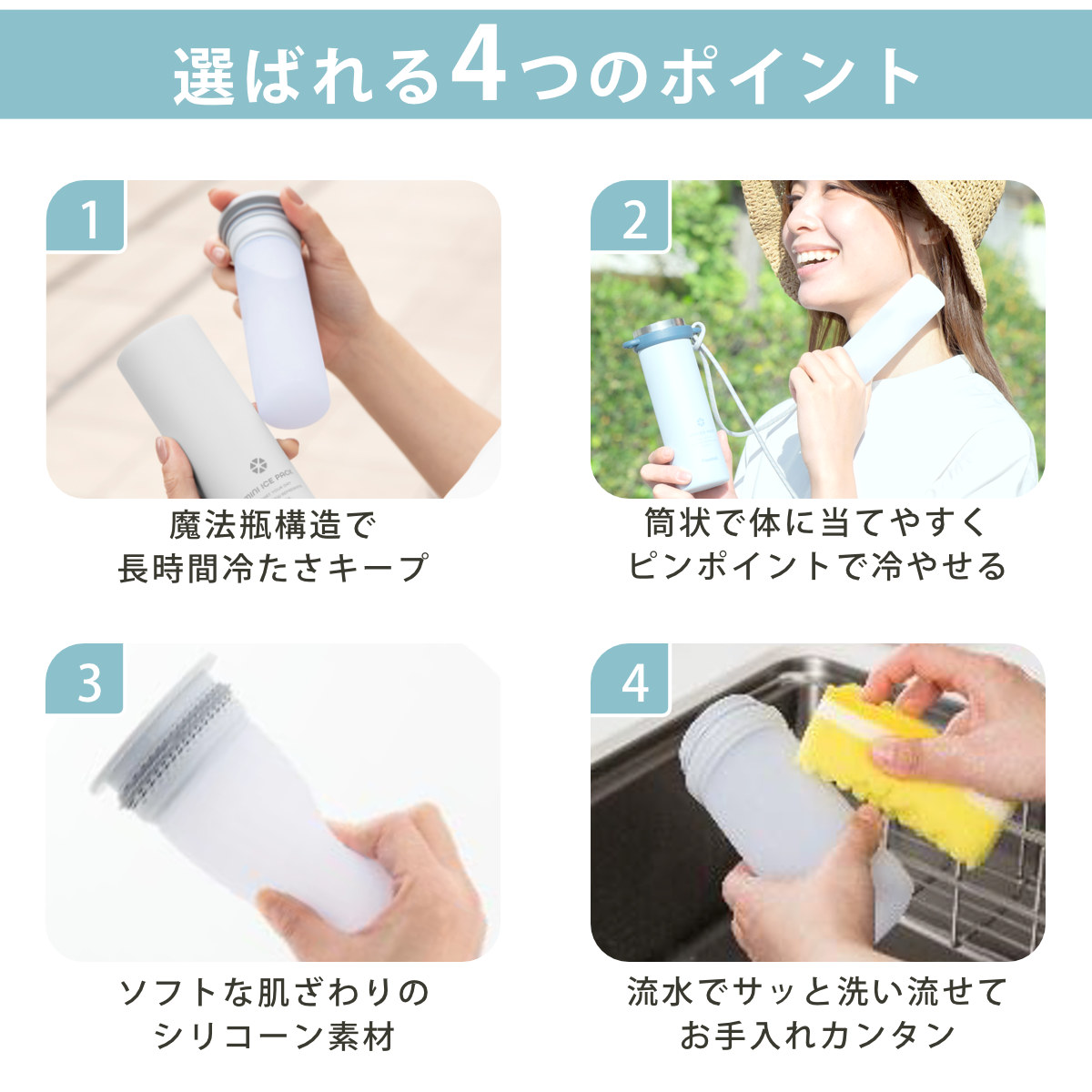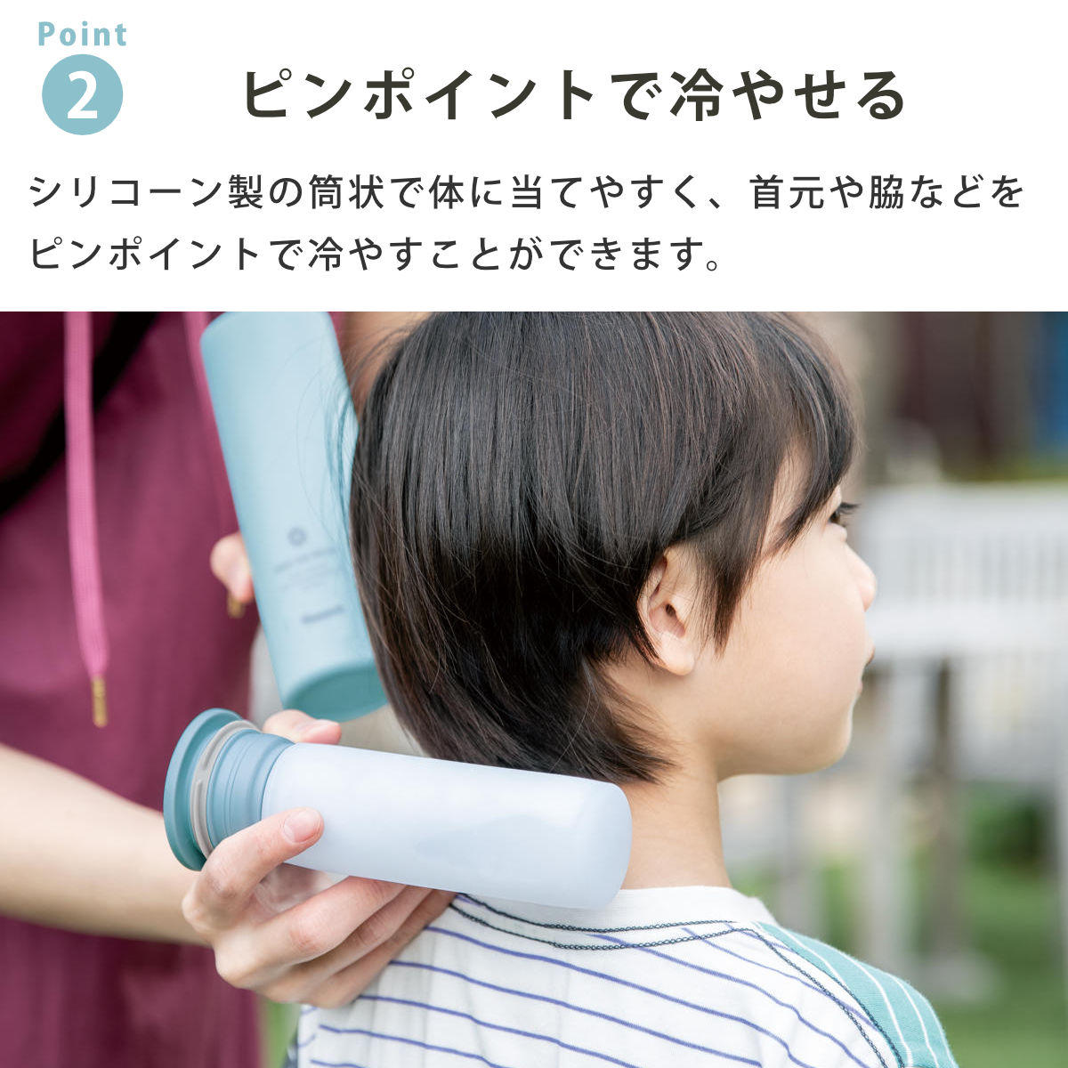 特に暑さが辛くなってくる時期に最適です。小さなお子様にもお使いいただけるので、ピクニックや炎天下の通学等の移動、スポーツ観戦など、幅広いシーンで熱中症対策として大活躍します。夏場に限らず冬場は発熱時のアイシングにもご使用いただけます。年間を通して使えるので自然にも優しいエコな商品です。