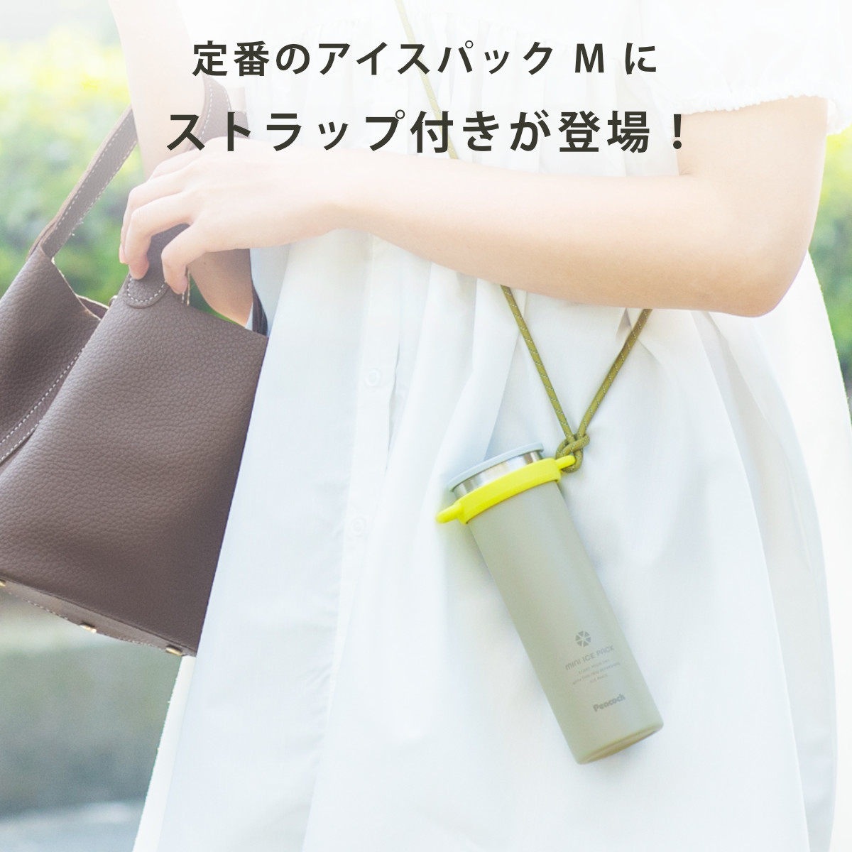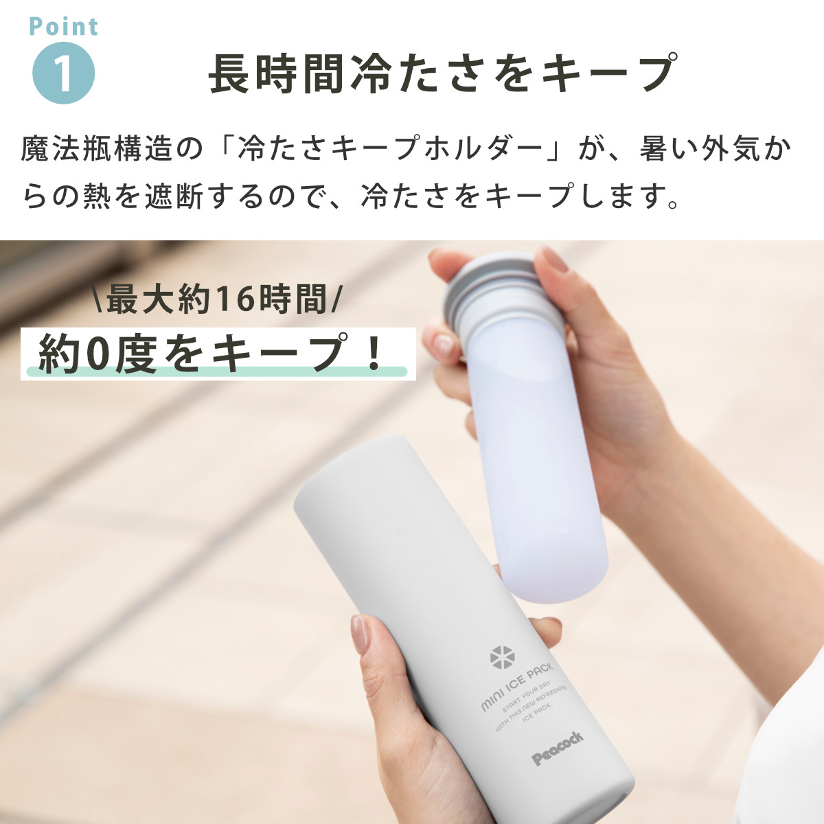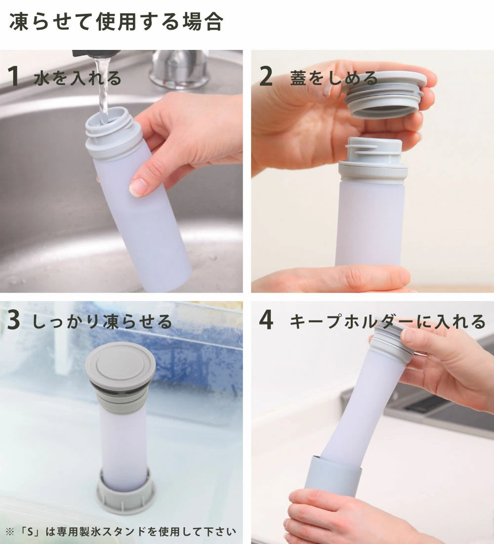 持ち運びに便利なキープホルダーに入れて、外出先でも簡単にクールダウンすることができます。キープホルダーは、瓶内部に外気温からの影響を伝えにくい魔法瓶構造なので、長時間保冷状態を保ち、氷も長持ちします。