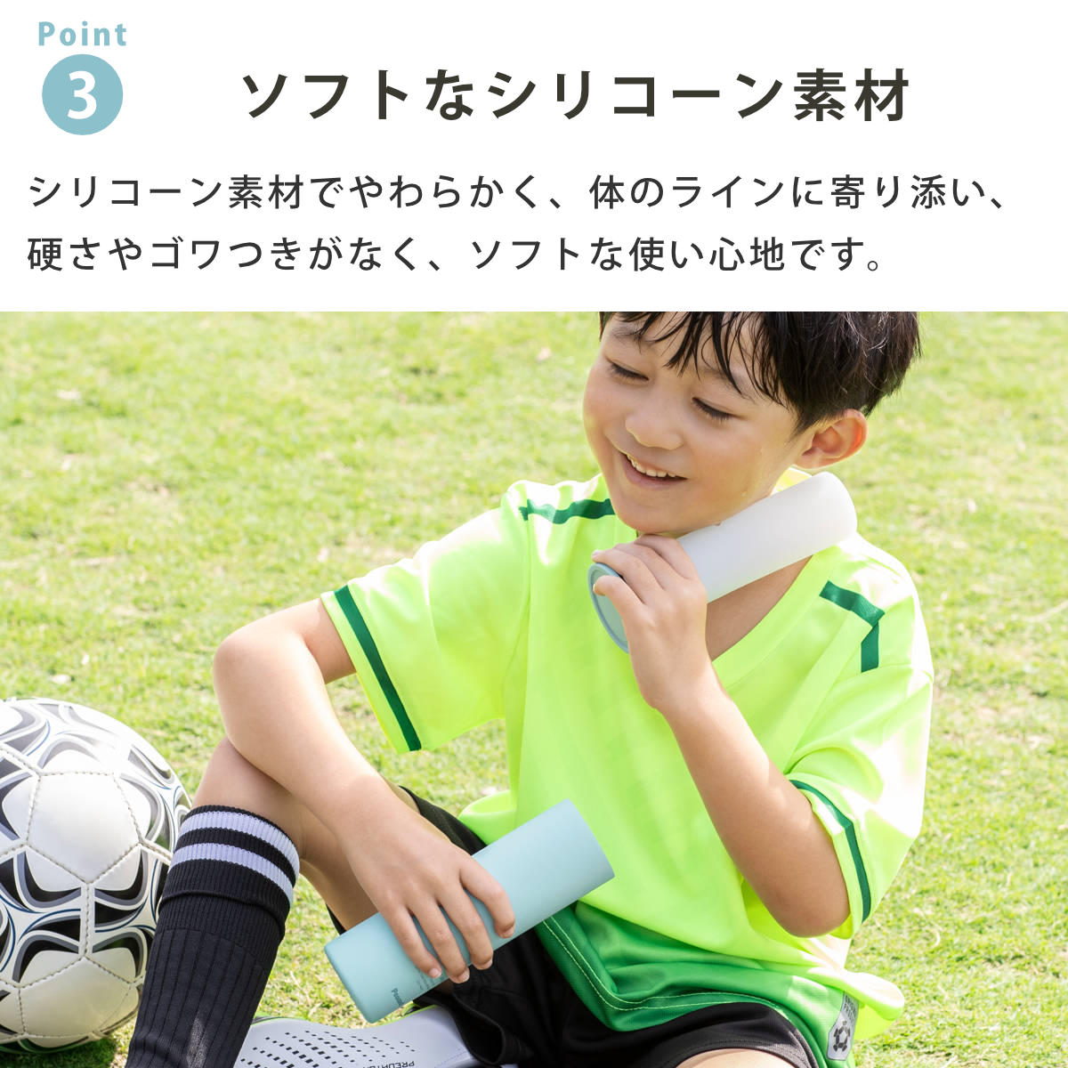 シリコーンは柔軟性が高いため、首筋、手首、足首、膝などの凹凸がある部位にも隙間なくフィットします。
