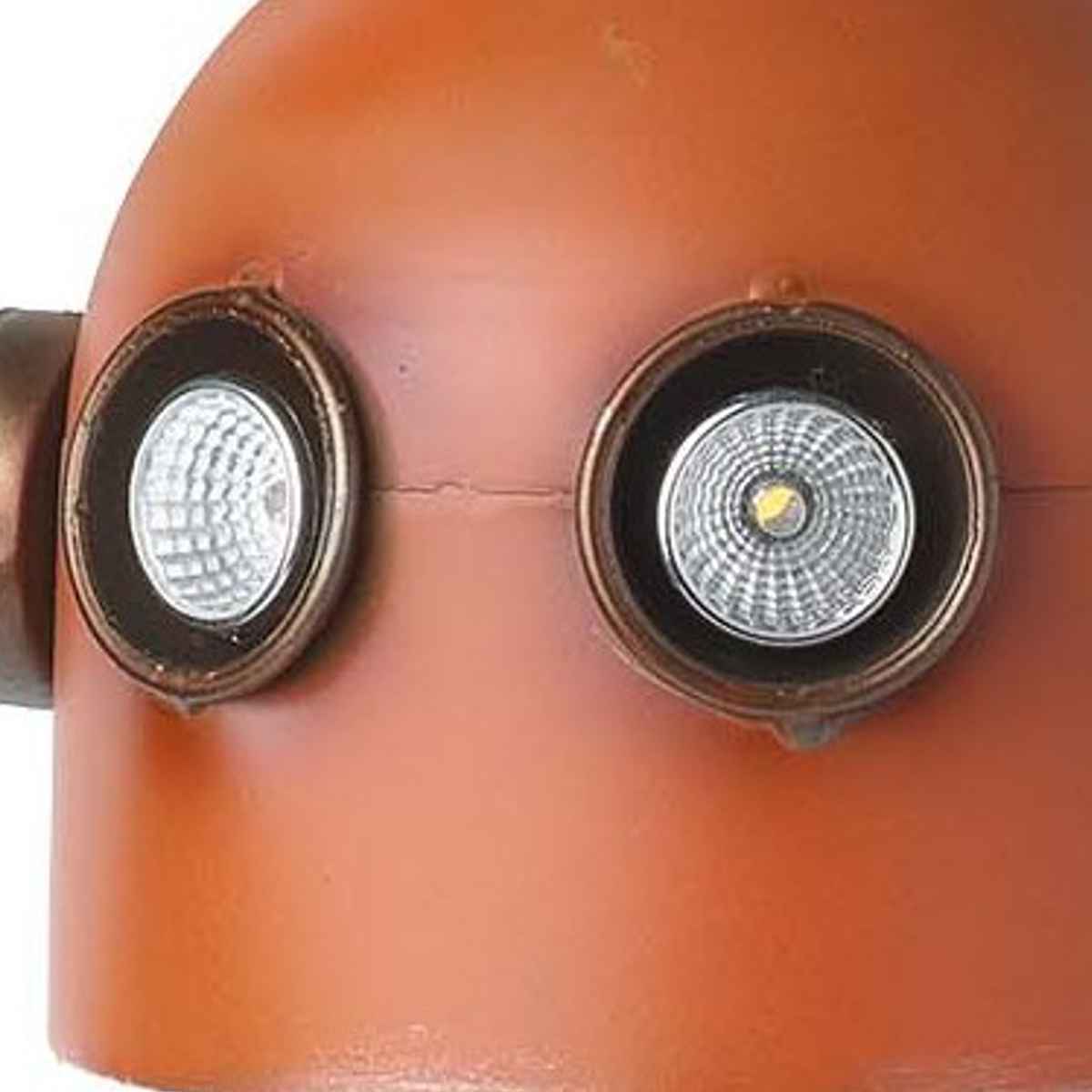 頭上にソーラーライトが付いていて、暗くなるとロボットの目が点灯します。昼と夜で異なる表情を楽しめます。