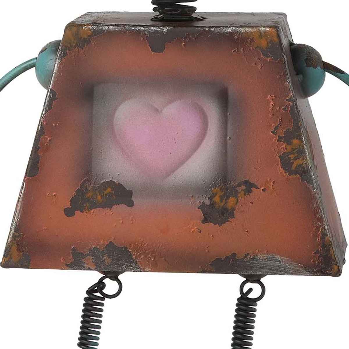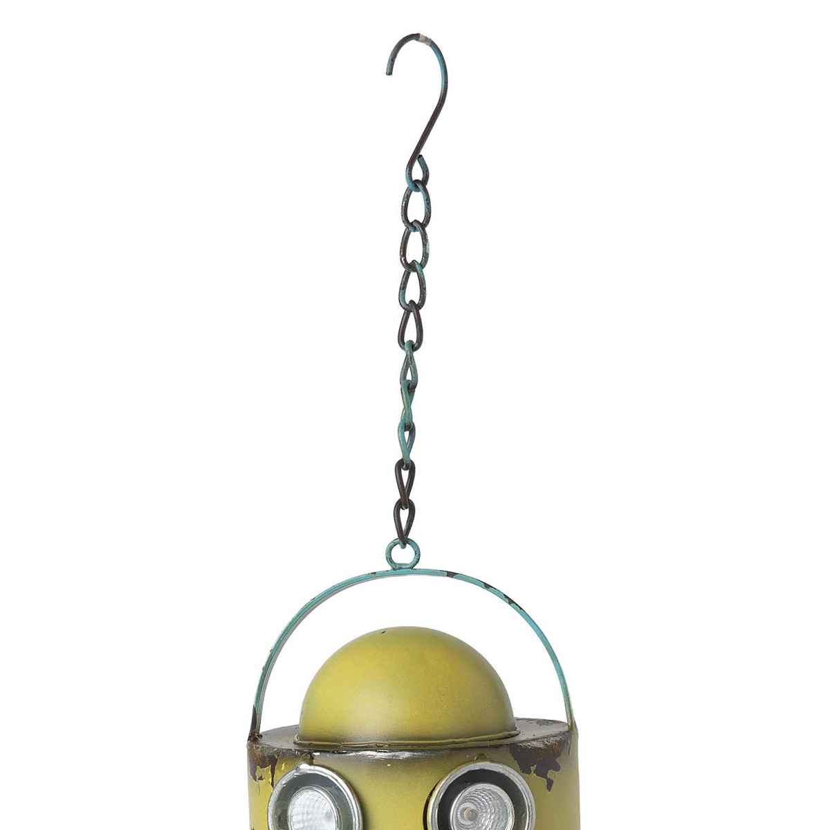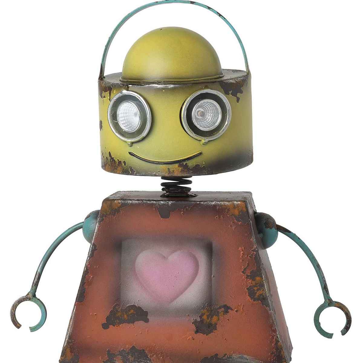 頭上にソーラーライトが付いていて、暗くなるとロボットの目が点灯します。昼と夜で異なる表情を楽しめます。