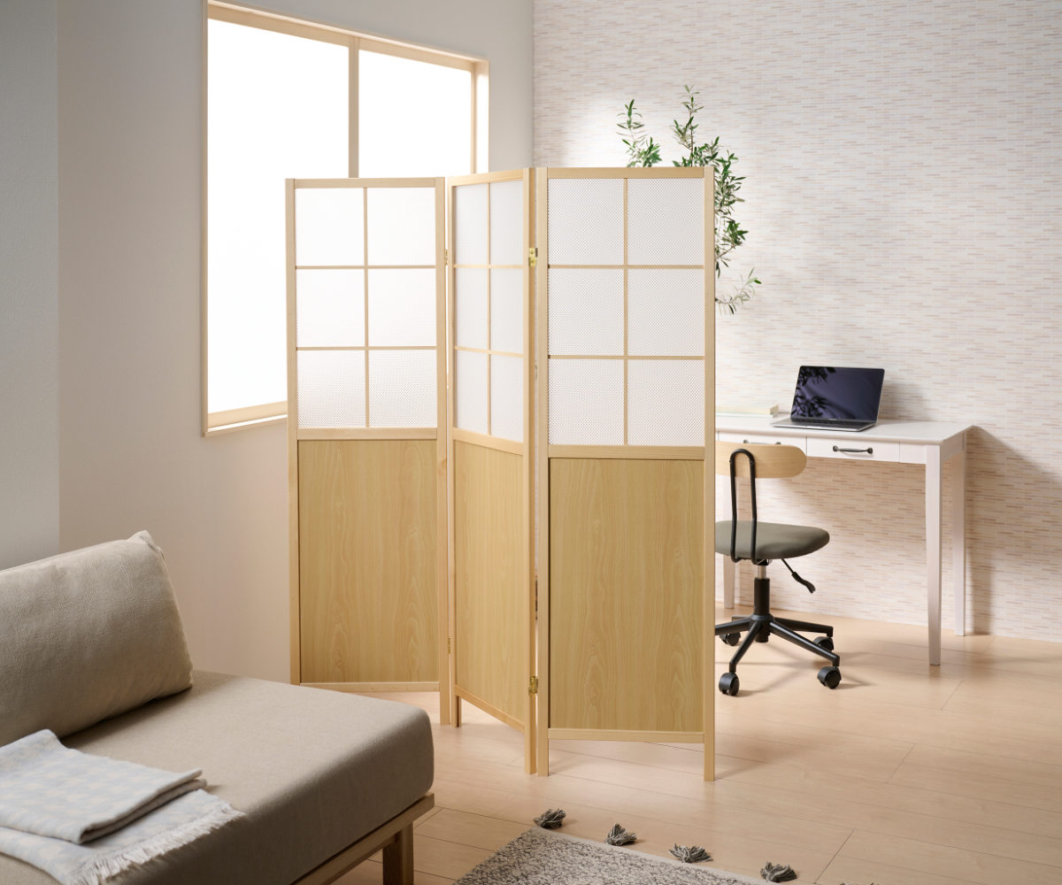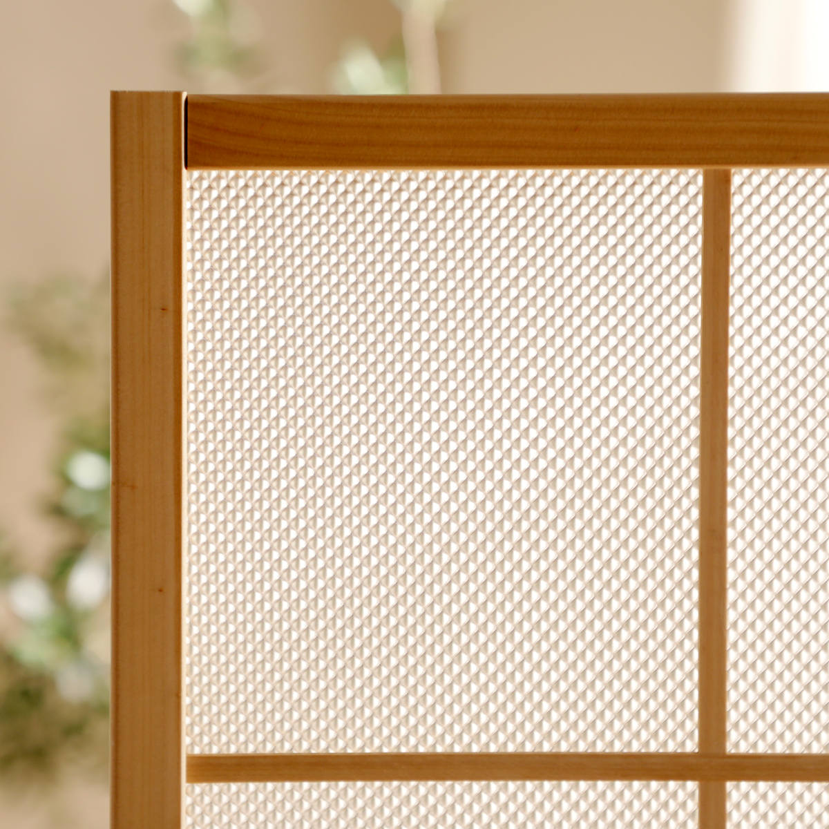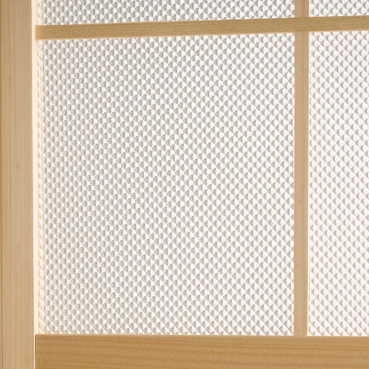 窓枠を思わせる天然木フレームに、凹凸のある半透明パネルを組み合わせたデザイン。視線をほどよく遮りつつ、光をやわらかく拡散し、空間を明るく保ちます。
