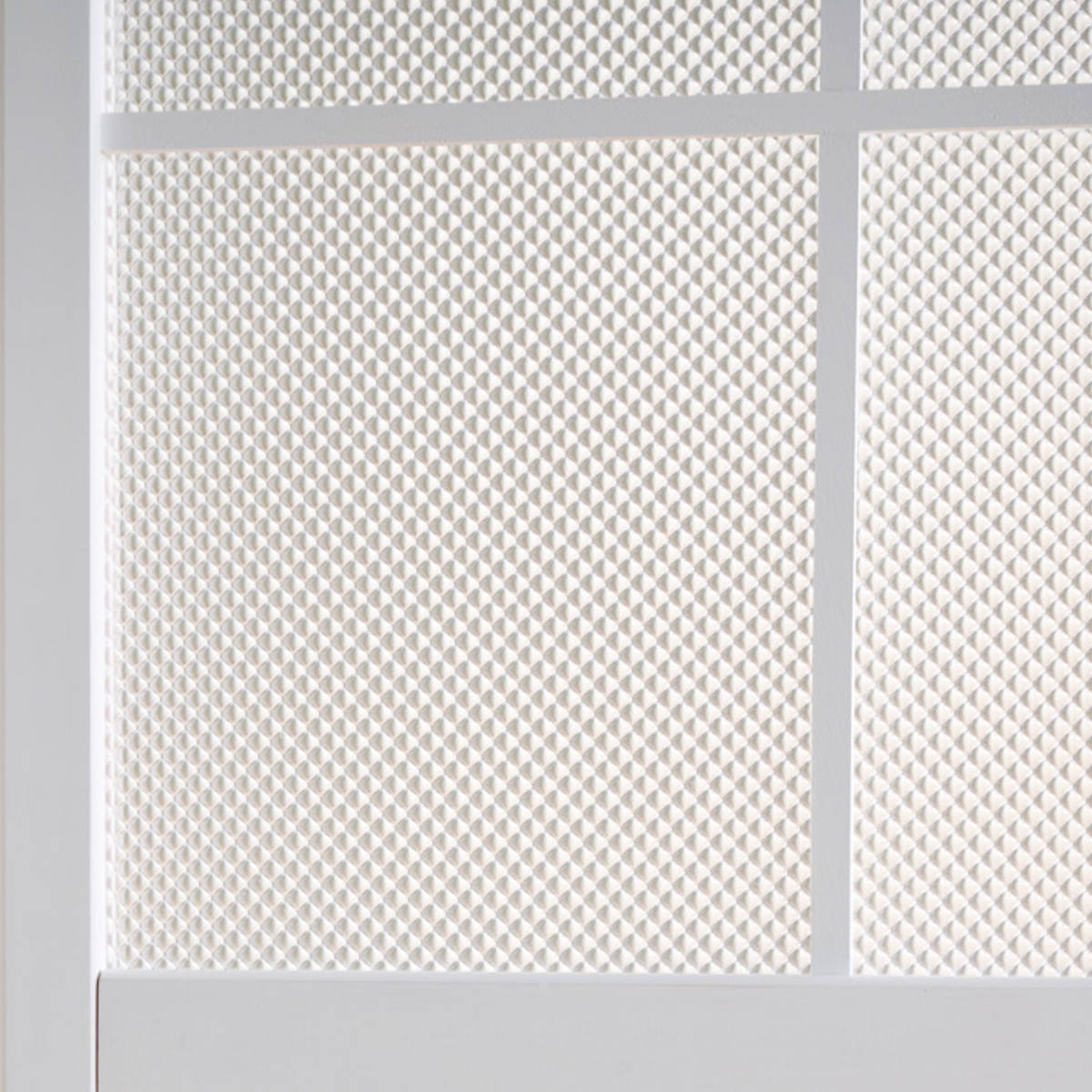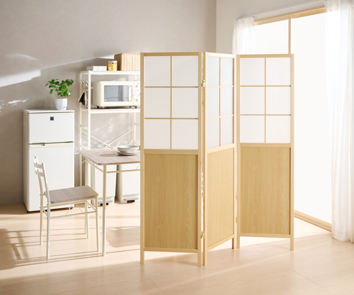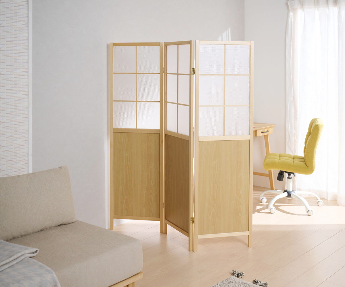 窓枠を思わせる天然木フレームに、凹凸のある半透明パネルを組み合わせたデザイン。視線をほどよく遮りつつ、光をやわらかく拡散し、空間を明るく保ちます。