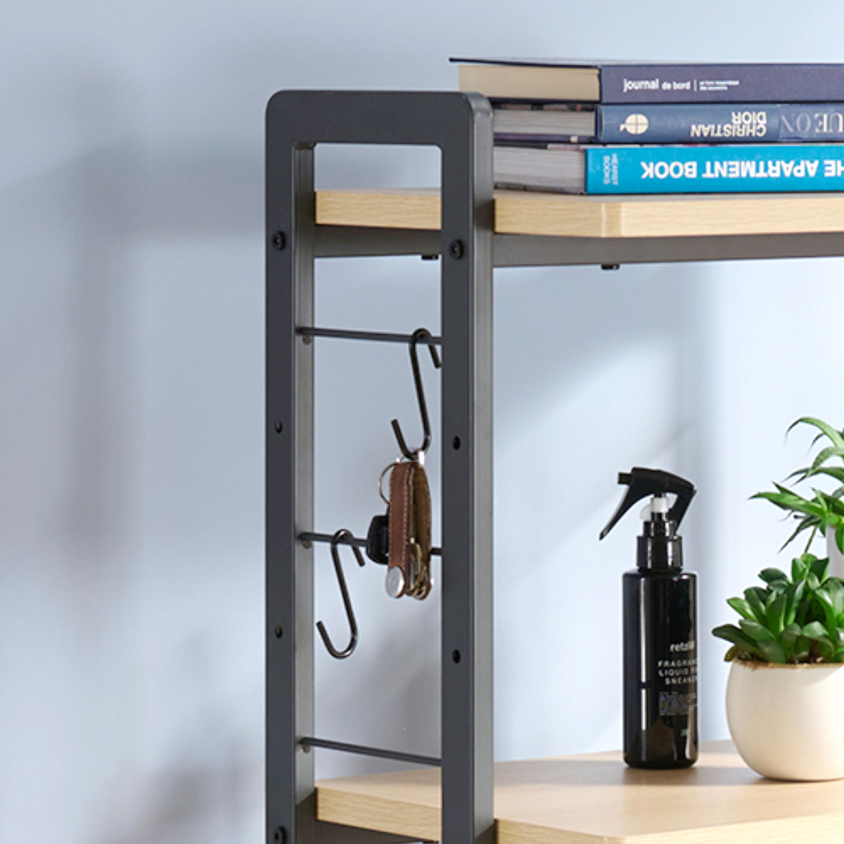 付属のS字フック3個を使えば、バッグや小物、文房具などをラックのサイドに掛けて収納できます。棚の上だけでなく、側面も有効活用できるので、作業スペースをすっきり保つことができます。