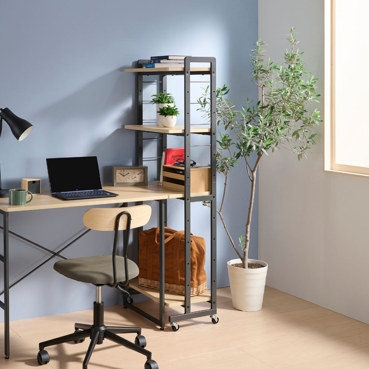 デスクと揃えて使える、便利な高さ調整棚