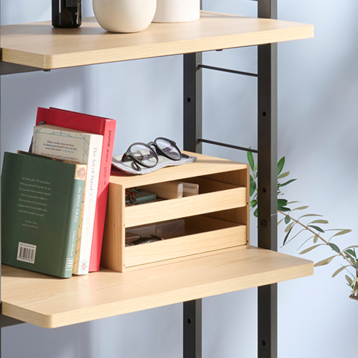 棚板は11.5cmピッチで高さ調整可能。デスク天板と高さを揃えれば、作業スペースの延長としても活用でき、プリンターや書類、小物などの整理もスマートに行えます。